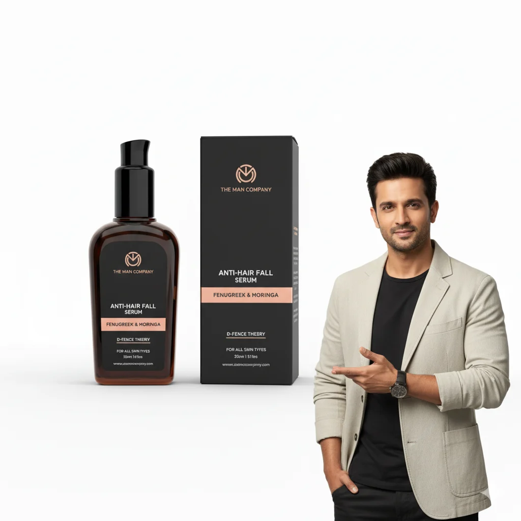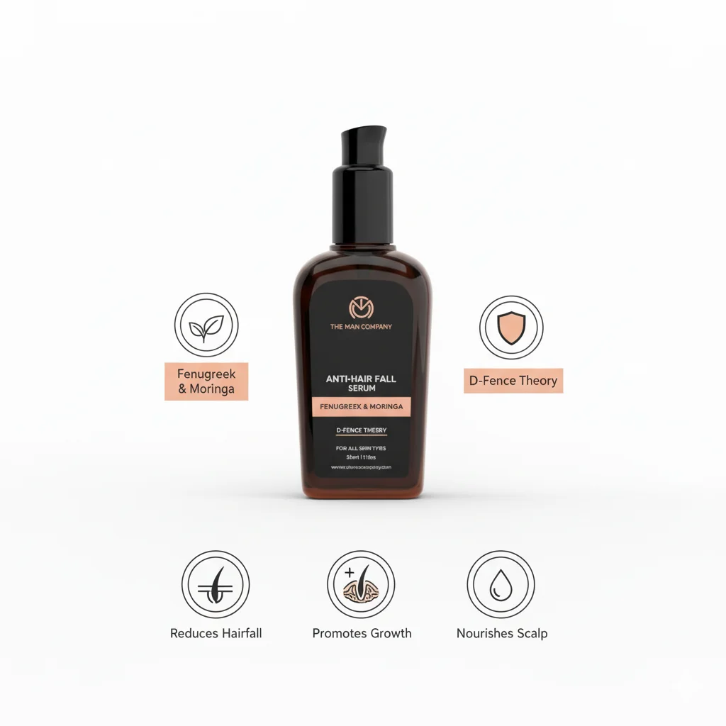 “THE MAN COMPANY ANTI-HAIR FALL SERUM with the powerful combination of Fenugreek & Moringa is a targeted treatment designed to combat hair fall and promote healthier hair growth for men. This lightweight, non-greasy serum, part of the D-FENCE THEORY line, is formulated to strengthen hair follicles, nourish the scalp, and reduce hair breakage. Fenugreek (Methi) is a traditional ingredient known to prevent hair fall and stimulate growth, while Moringa, rich in vitamins and minerals, provides essential nutrients to fortify hair from the root. Applied directly to the scalp, this serum works to improve hair density, reduce thinning, and create a healthier environment for hair growth, making it suitable for all skin types and an effective solution for those experiencing hair fall.”