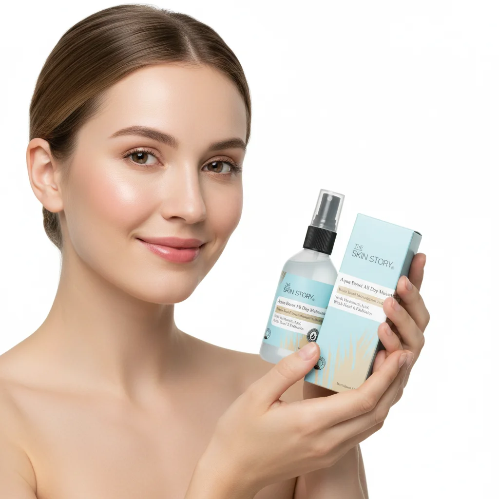 The Skin Story Aqua Boost All Day Moisturiser is a lightweight, water-based formula designed to provide instant and long-lasting hydration for your skin. This fast-absorbing moisturiser recharges the skin, leaving it with a revitalized look and improved natural moisture. Its superior water-based technology offers a quick fix for hydration while also ensuring long-lasting effects. Formulated with key ingredients like Hyaluronic Acid, Witch Hazel, and Prebiotics, this moisturiser helps to build lost moisture and collagen, keeping the skin firm and plump. Witch Hazel, a natural medicinal plant, helps to minimize pores, reduce inflammation and redness, and soothe the skin. Prebiotics work to maintain a healthy balance of bacteria on the skin’s surface. This non-sticky, non-oily formula is suitable for all skin types, including sensitive and oily skin, and can be used as part of both your day and night skincare routines. It is 100% vegan, cruelty-free, and dermatologically tested.