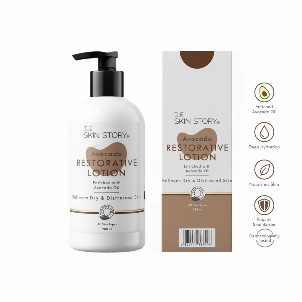 Featured in the image is The Skin Story Avocado Restorative Lotion, a skincare product designed to provide deep nourishment and relieve dry, distressed skin. This lotion is formulated to replenish moisture that is often lost due to environmental factors like pollutants and UV rays.