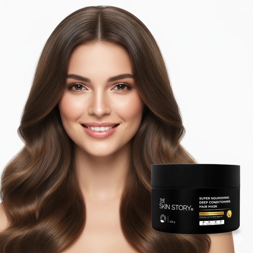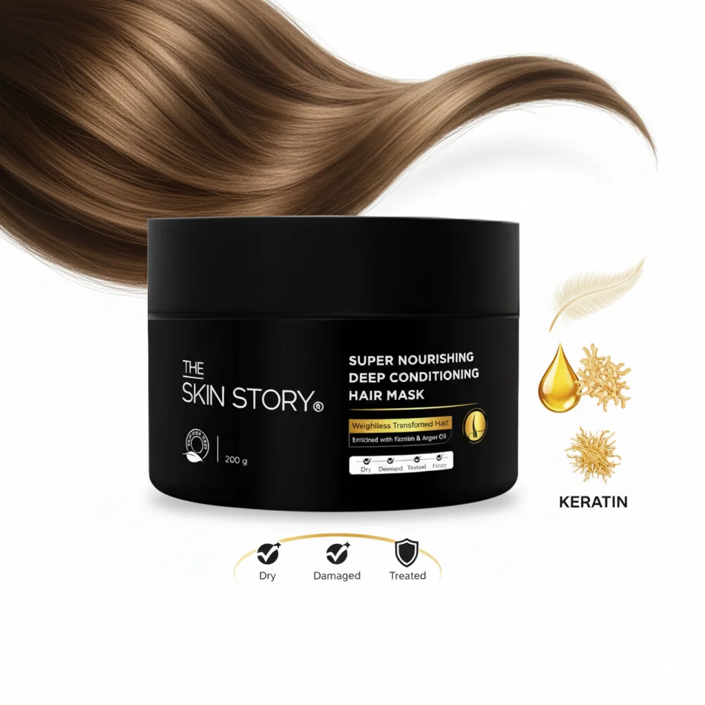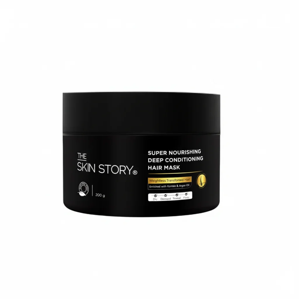 The Skin Story Super Nourishing Deep Conditioning Hair Mask is an intensive treatment designed to deeply nourish and repair dry, damaged, and frizzy hair. This rich and creamy mask works from within to restore moisture, strengthen strands, and reduce breakage. Formulated with a powerful blend of Keratin, Argan Oil, and Vitamin E, it replenishes the natural protein of the hair, enhancing its strength and elasticity. The Argan Oil helps to make hair shiny and silky, while Vitamin E provides natural nourishment and hydration. This spa-like treatment is safe for colored and chemically treated hair, helping to control frizz and leave your hair feeling soft, smooth, and healthy. The formula is 100% vegan, cruelty-free, and does not contain sulphates or parabens.