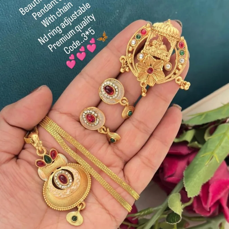 Embrace the splendor of traditional Indian craftsmanship with this exquisite antique gold-plated jewelry set. This regal three-piece ensemble features a beautifully designed circular pendant with a premium matching chain, a pair of coordinating drop earrings, and a magnificent statement ring. The set artfully combines intricate gold filigree, Meenakari-style enamel work, and vibrant stonework to create a look of timeless elegance.