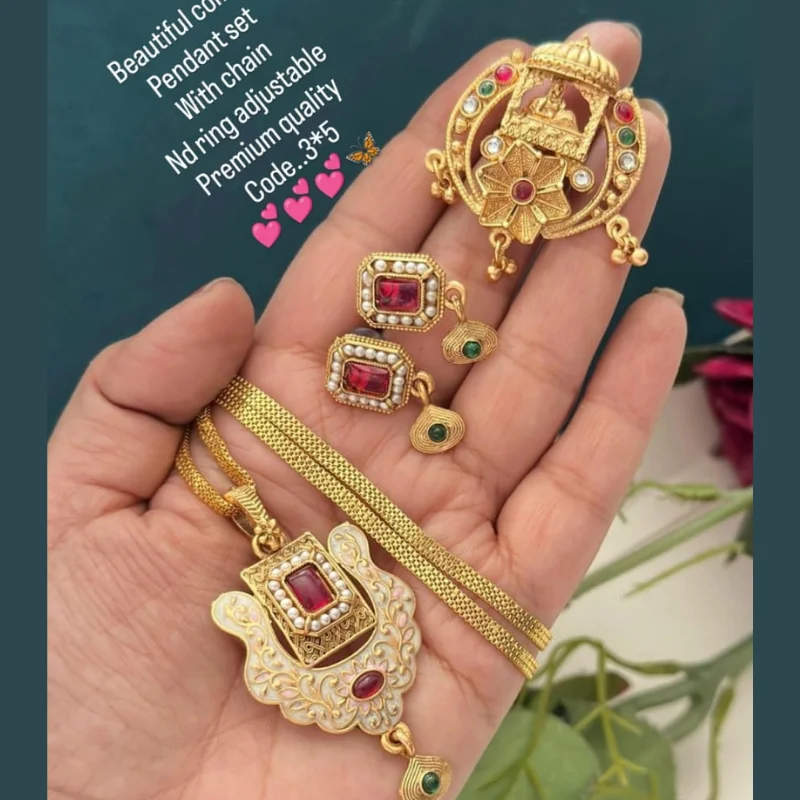 Discover the essence of royal heritage with this masterfully handcrafted antique gold-plated jewelry set. This regal three-piece ensemble features a beautifully detailed pendant with a premium gold-toned chain, a pair of elegant matching drop earrings, and a grand statement ring. The set seamlessly blends traditional techniques, including intricate Meenakari (enamel) work and fine gold-plated filigree.