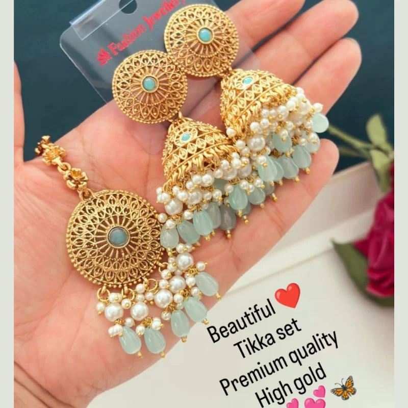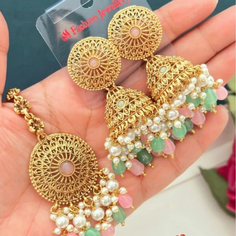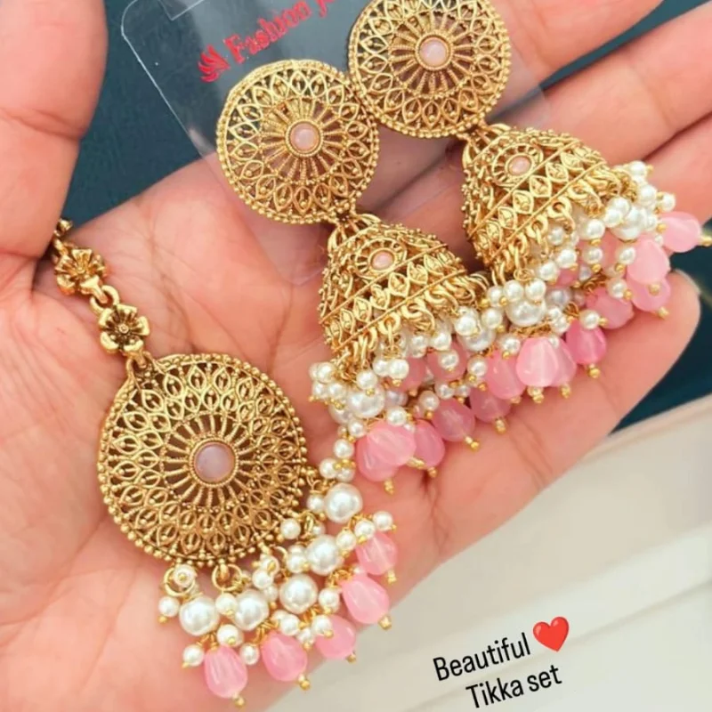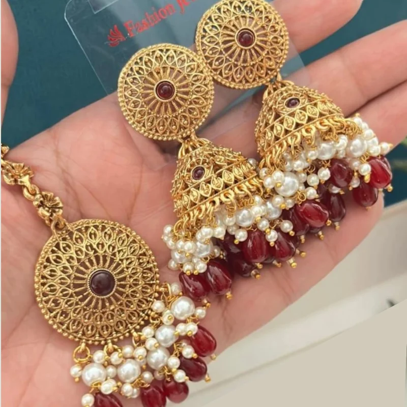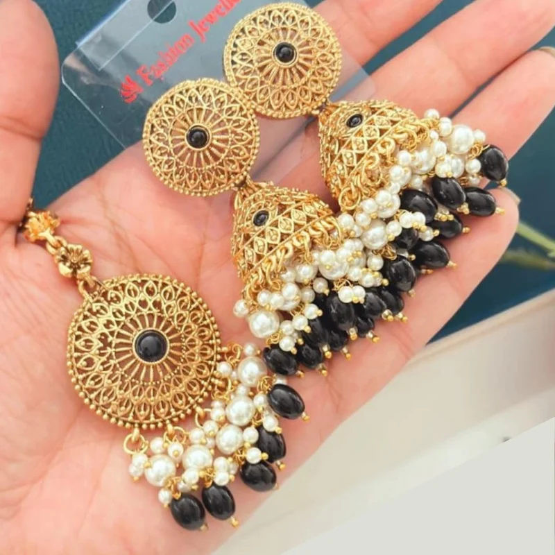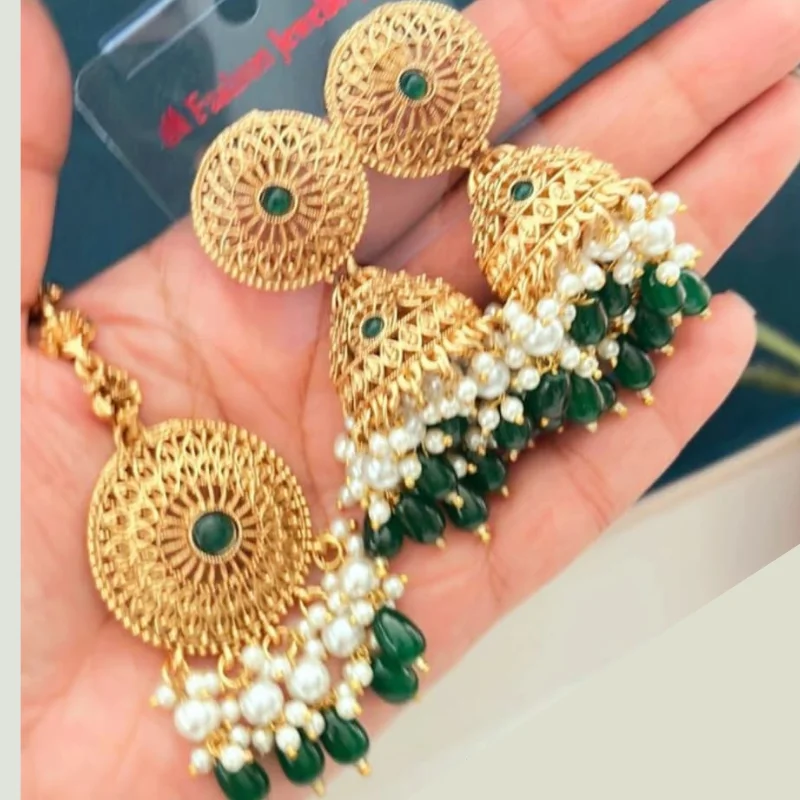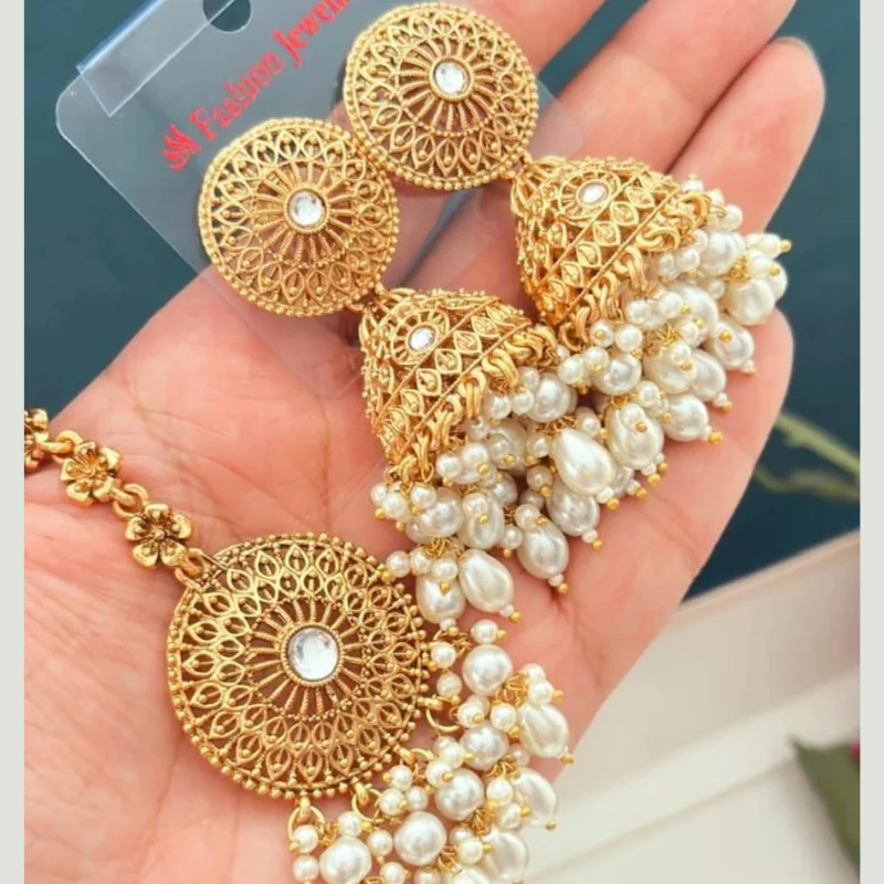 Traditional Antique Gold-Plated Jhumka Earrings & Maang Tikka Set