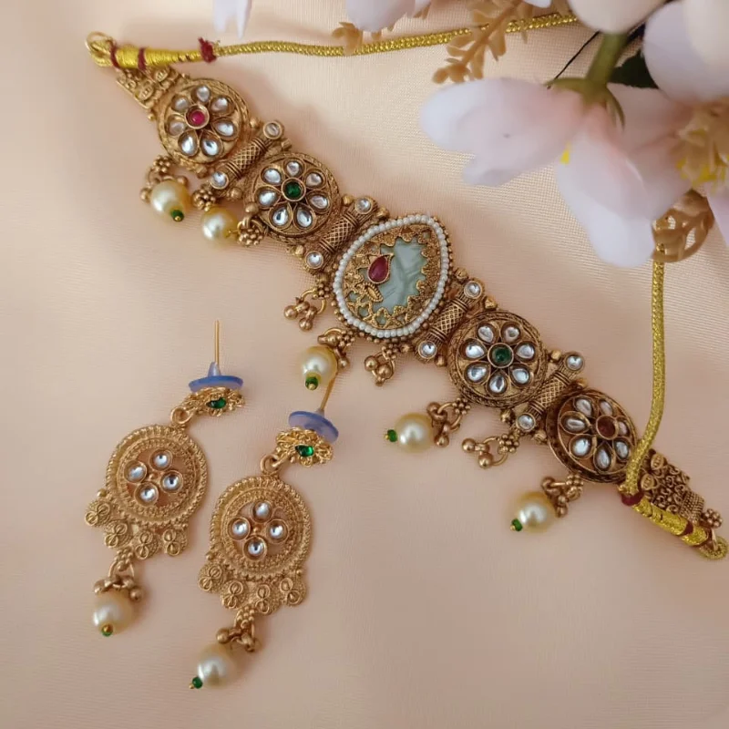 Full Product DescriptionElevate your ethnic ensemble with this breathtaking Pastel Pearl Choker Jewellery Set, a perfect blend of traditional grandeur and