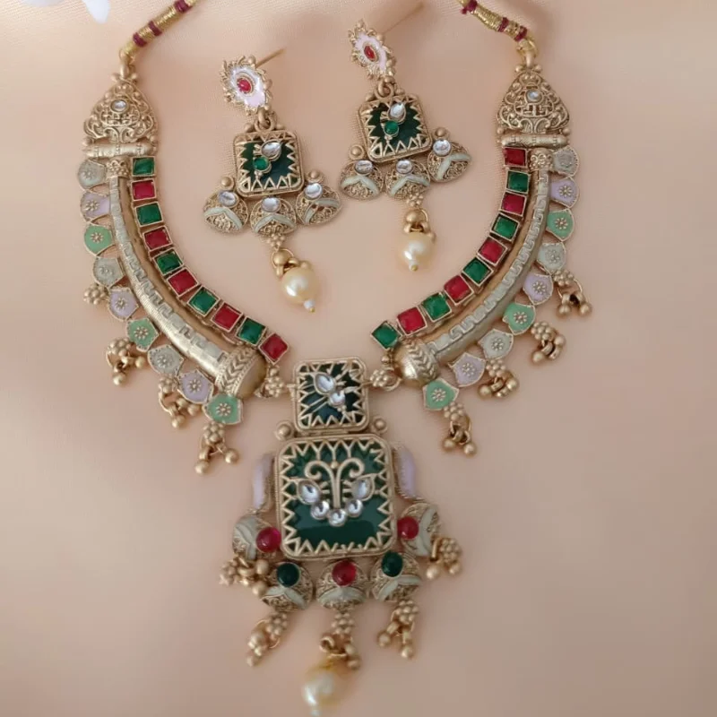 Traditional Antique Gold-Plated Kundan & Emerald Pearl Choker Necklace Set with Matching Jhumka Earrings