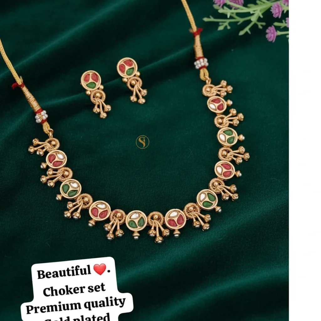 The set includes a matching pair of floral-coin stud earrings that perfectly complement the choker. Secured with an adjustable high-quality thread (dori) at the back, this set promises both style and comfort for long hours of wear during weddings, festivals, and special occasions.