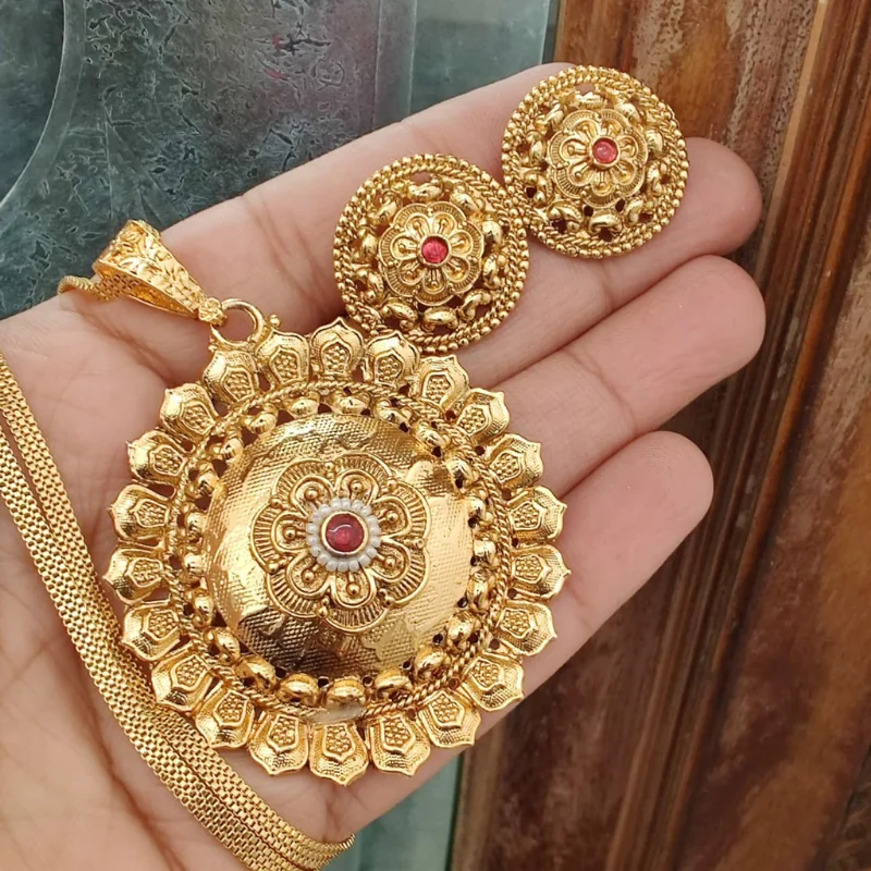 Elevate your ethnic ensemble with this exquisitely crafted gold-plated jewelry set. This set features a magnificent, large circular pendant with a unique 3D dome (convex) design. At its heart lies a vibrant ruby-red stone, beautifully framed by a delicate border of shimmering white seed pearls. The pendant is further adorned with an intricate, multi-layered petal-motif border, showcasing fine traditional craftsmanship.