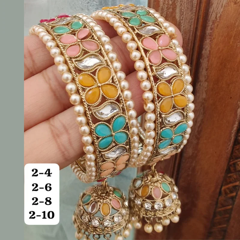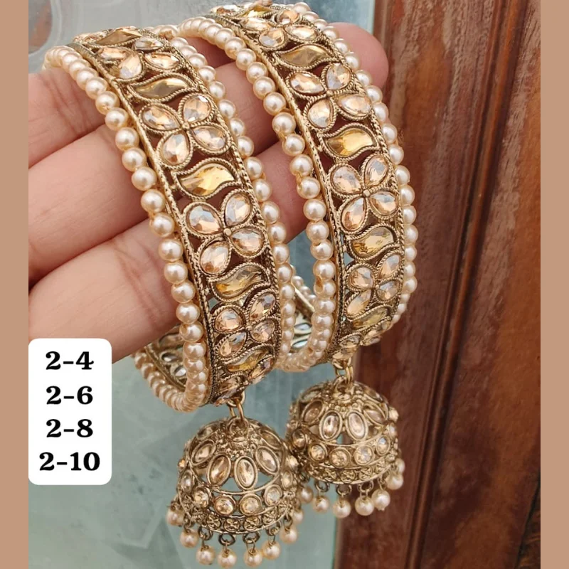 Traditional Gold-Plated Stone & Pearl Studded Bangles with Dangling Jhumkas