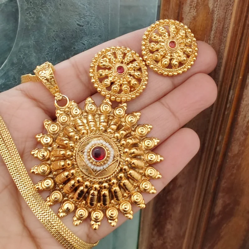 The most striking feature of the pendant is the outer sunburst rim, composed of intricate, polished rays tipped with golden beads, radiating a sense of power and elegance. This pendant is paired with matching stud earrings that replicate the regal sunburst motif in a more compact, wearable size. The set is completed with a high-quality, flat-link gold-plated chain, making it an ideal statement piece for traditional celebrations, weddings, and festive gatherings.