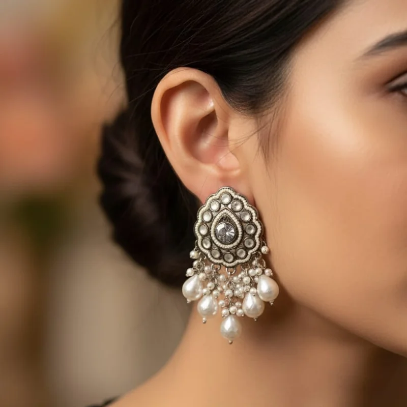 Add a touch of timeless elegance to your ethnic ensemble with these stunning traditional drop earrings. Designed to perfectly complement a “Traditional Outfit Look,” these earrings feature a beautifully crafted scalloped floral medallion as the primary stud. At its heart lies a large, radiant clear stone, encircled by a halo of shimmering smaller crystals set into a refined silver-toned base with intricate beadwork detailing.