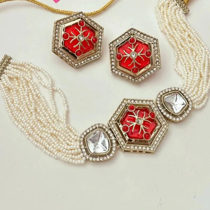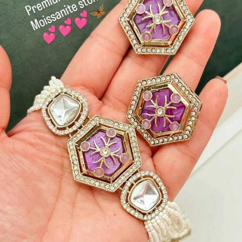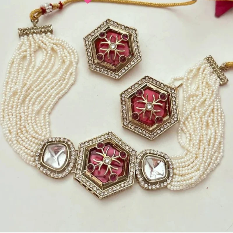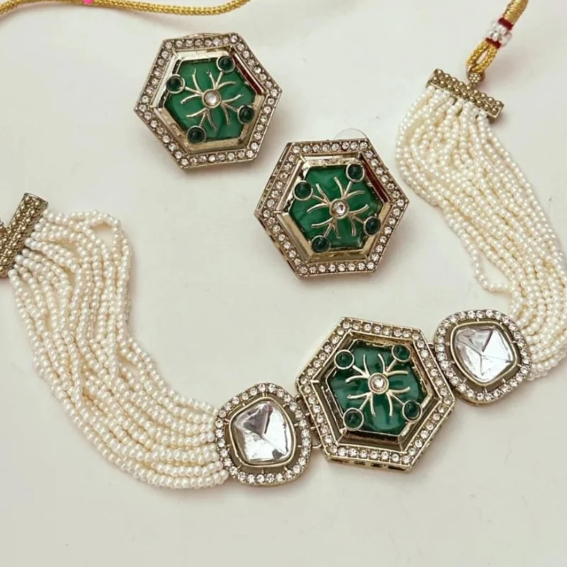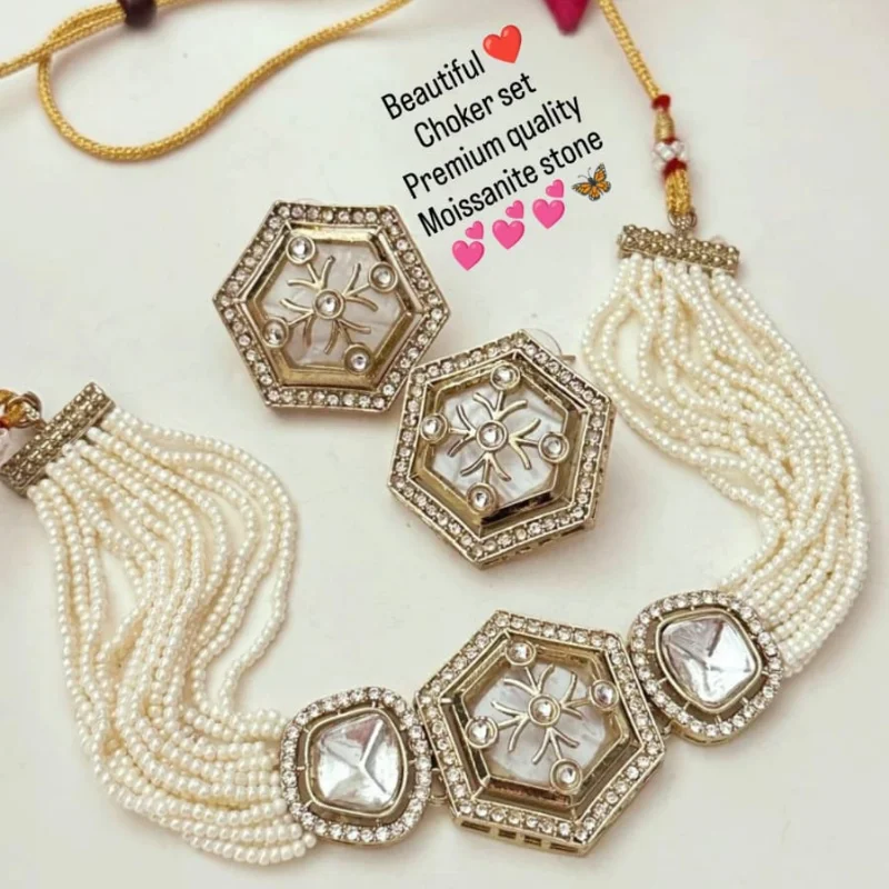 Trendy Hexagonal Moissanite Pearl Choker Set | Premium Contemporary Ethnic Jewelry