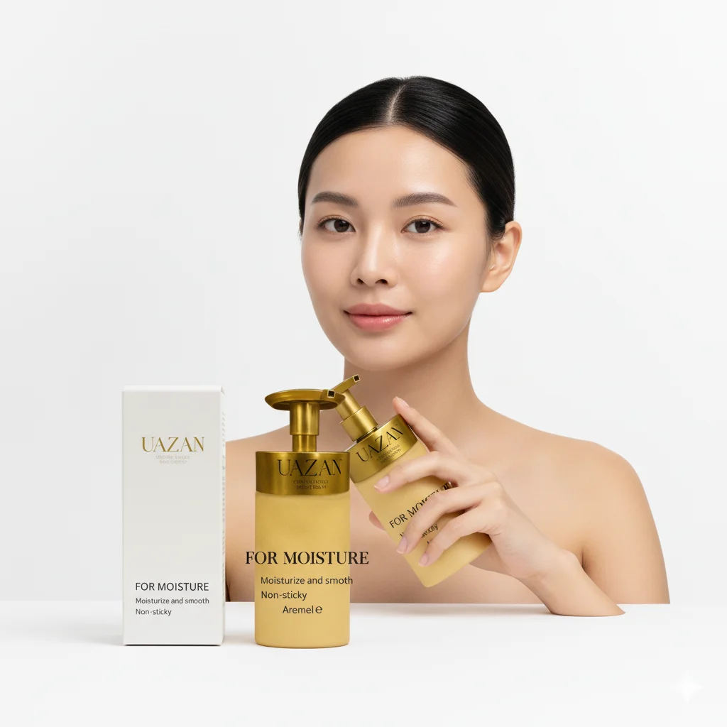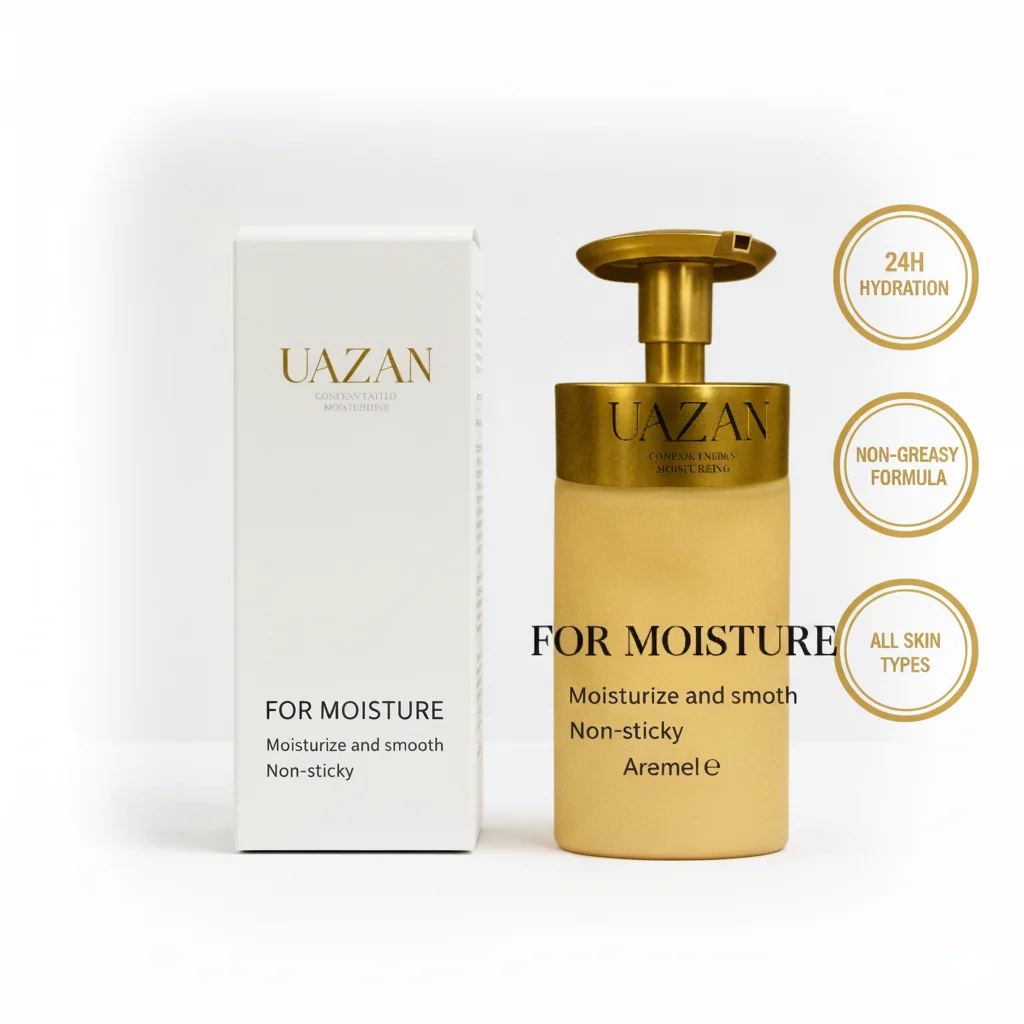 This product by UAZAN is a concentrated moisturizing formula designed to hydrate and smooth the skin. The packaging indicates that it is a non-sticky formula, suggesting a lightweight texture that absorbs easily. The product comes in a cylindrical bottle with a gold pump dispenser and is accompanied by a white box with gold lettering. The label on both the bottle and the box emphasizes its moisturizing properties.