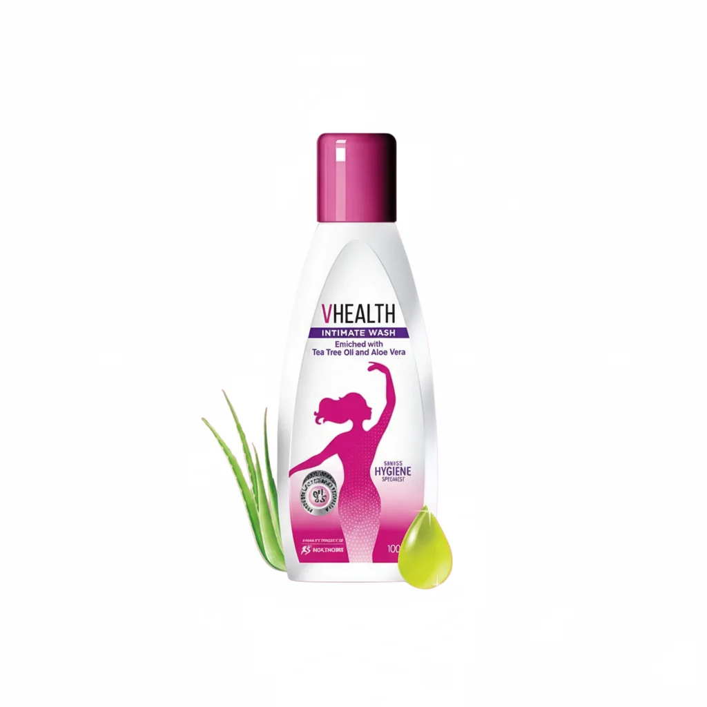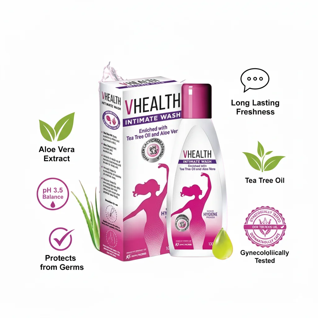 The VHEALTH Intimate Wash is a feminine hygiene product enriched with “Tea Tree Oil and Aloe Vera.” It is specifically formulated to maintain a “pH 3.5 Balance,” which is crucial for intimate health, and is highlighted as “GYNECOLOGICALLY TESTED.” The product promises “Long Lasting Freshness” and “Protects from Germs.” It comes in a sleek bottle with a pink cap and a white label featuring a silhouette of a woman, emphasizing its target demographic. The packaging includes a carton box that reiterates the key benefits and ingredients. The overall presentation uses pink and green accents, suggesting both feminine care and natural ingredients.