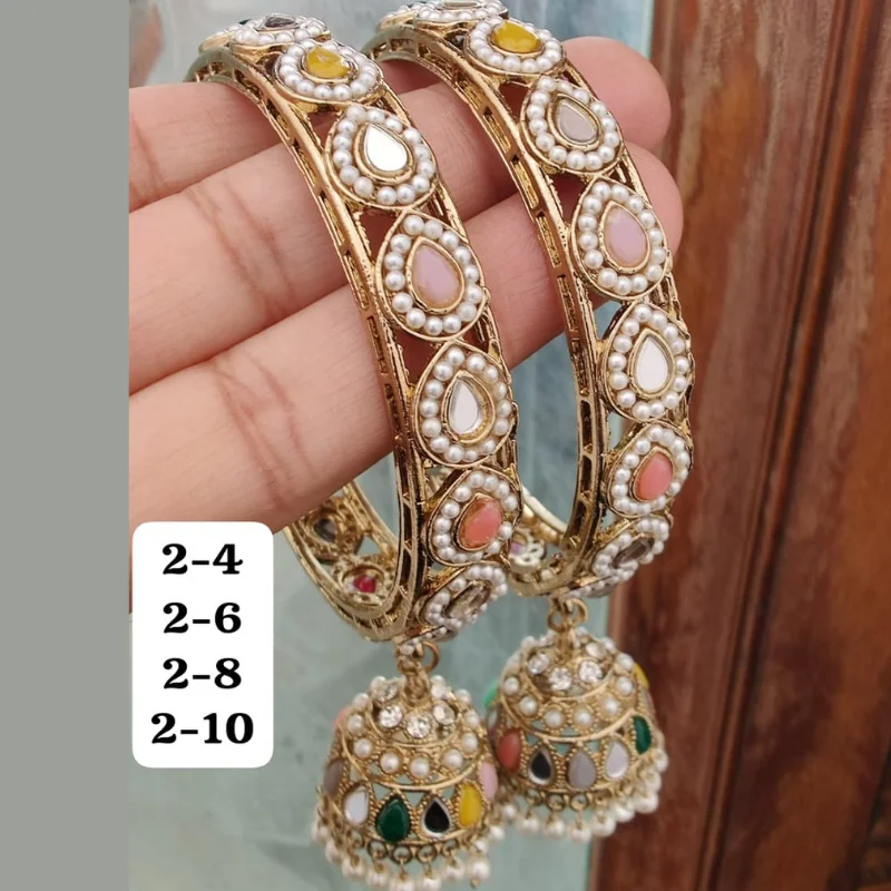 Infuse your jewelry collection with traditional charm and a splash of color with these exquisite Gold-Plated Bangles. These elegant kadas are meticulously designed with a row of graceful teardrop-shaped motifs, each framed by a delicate border of white seed pearls. The motifs feature a beautiful assortment of multi-color stones and reflective mirrors in soft shades of pink, sunny yellow, peach, and classic white, creating a radiant and festive look. The standout feature is the traditional bell-shaped jhumka dangling from each bangle, intricately decorated with matching colorful stones and finished with a graceful fringe of white pearl beads. Whether you’re a bride, a wedding guest, or celebrating a festival, these statement bangles are designed to provide a stunning movement and a touch of royal heritage to your ethnic ensemble.