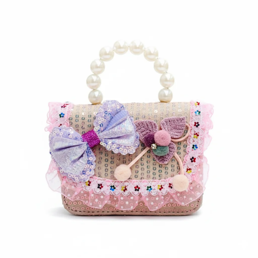 To top it all off, the bag is fitted with a stunning top handle made of large, lustrous faux pearls, adding a touch of sophistication. Whether used as a flower girl accessory or a birthday gift, this boutique-style purse is sure to be a treasured keepsake.