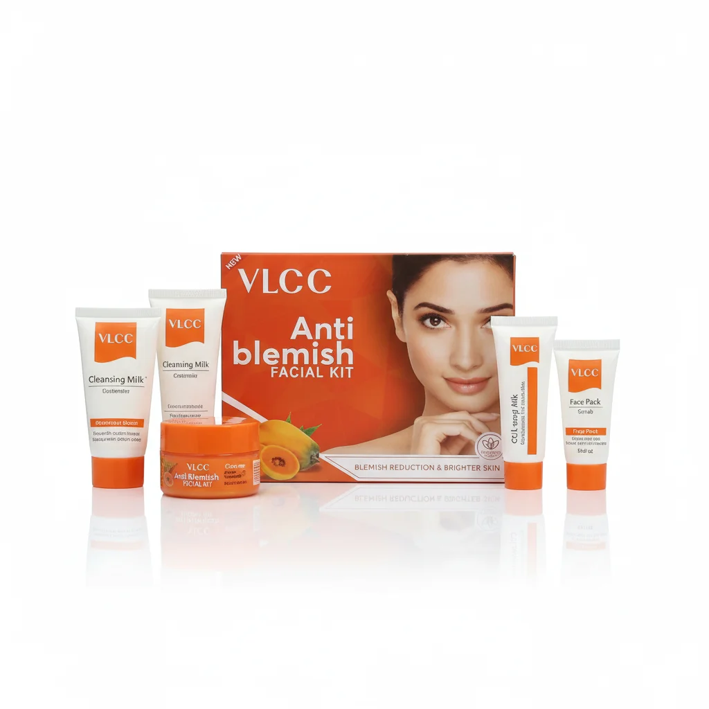 The VLCC Anti Blemish Facial Kit is a targeted skincare system designed to address blemishes, dark spots, and uneven skin tone, promoting a clearer and brighter complexion. This comprehensive kit typically includes a sequence of products like a cleansing milk, scrub, gel, and face pack, each formulated with active ingredients to reduce the appearance of blemishes, minimize pigmentation, and soothe the skin. The packaging clearly states “Anti Blemish Facial Kit” and often highlights natural ingredients such as papaya, known for its exfoliating and skin-lightening properties. The kit provides an at-home facial experience, making it convenient for individuals looking to diminish blemishes and achieve a more even, radiant skin tone.