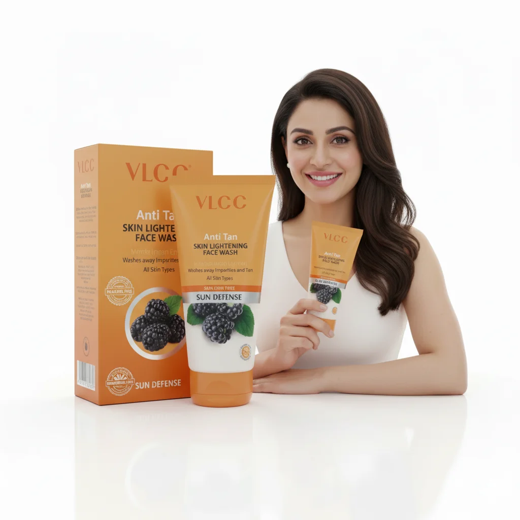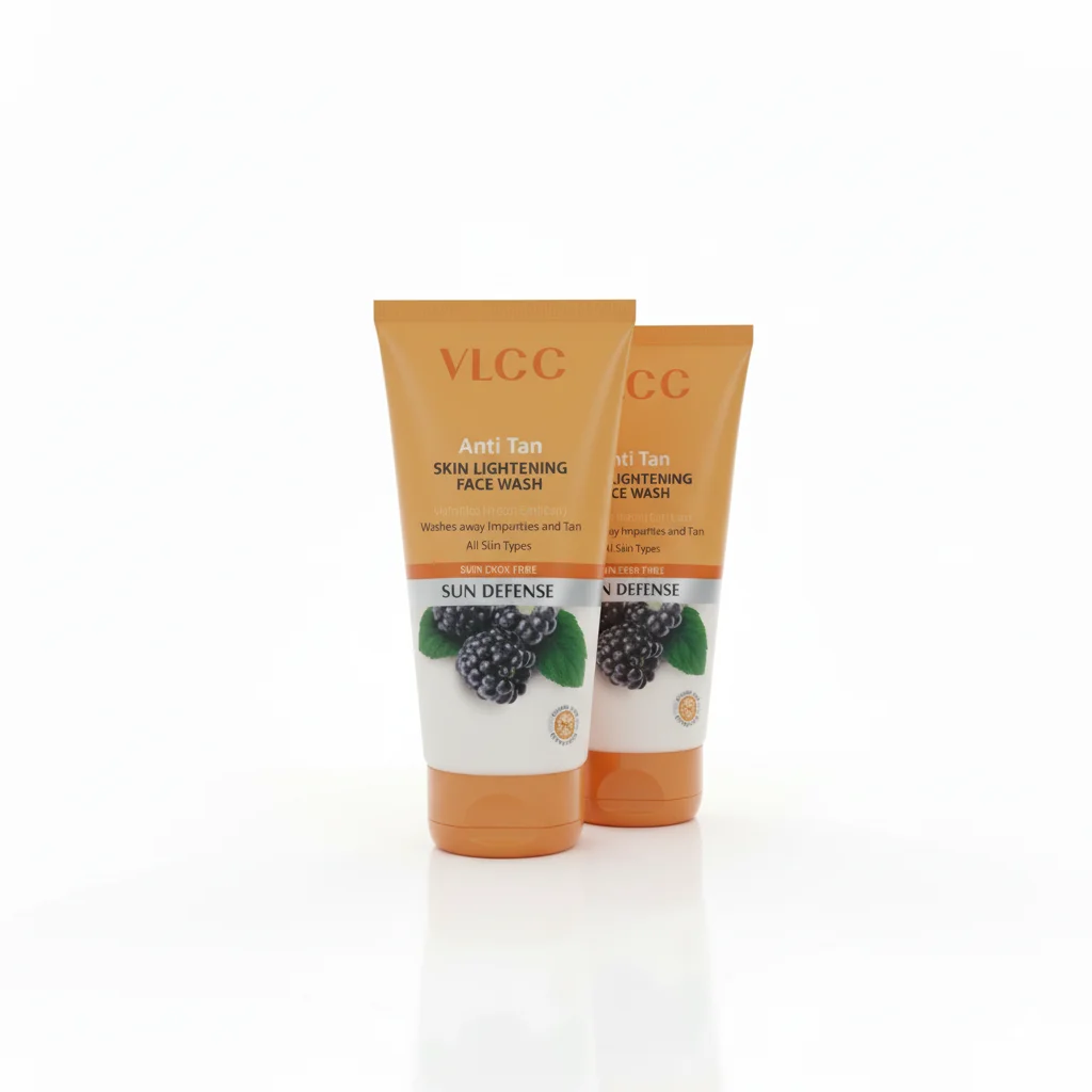 The VLCC Anti Tan Skin Lightening Face Wash is presented in an orange and white packaging, suggesting a focus on sun protection and skin brightening. The product is designed to cleanse the skin, removing impurities and helping to reduce tanning. It comes in a tube format, typical for face washes, and the packaging clearly indicates “Sun Defense” and features an image of blackberries, suggesting natural ingredients with antioxidant properties. The product claims to be suitable for “All Skin Types.”