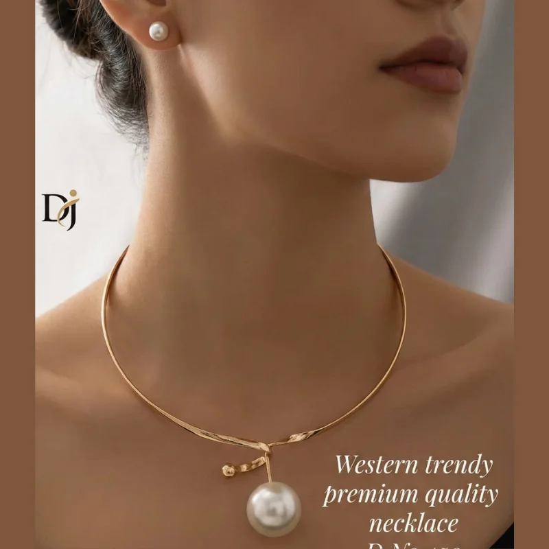 Redefine contemporary elegance with this “Western Trendy” jewelry set, masterfully designed for the modern woman. This premium quality set (Design No. 450) features a minimalist, structured gold-toned choker that sits beautifully against the neckline. The centerpiece is an artistic, asymmetrical twist of polished gold metal, from which hangs a single, large, high-luster pearl that creates a sophisticated and eye-catching focal point.