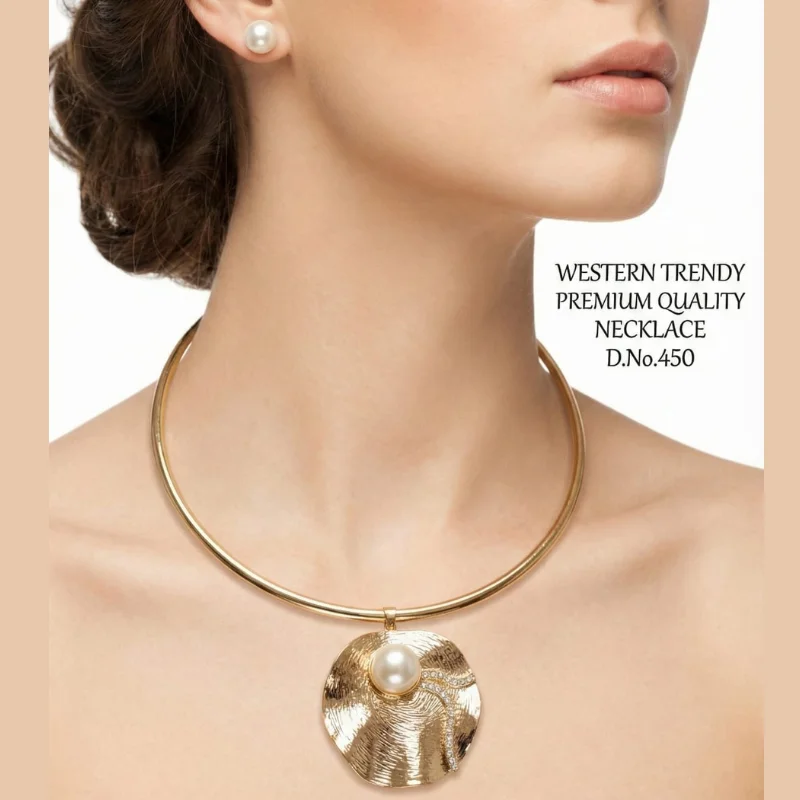 Elevate your accessory collection with this “Western Trendy” premium quality jewelry set, masterfully crafted for those who love bold, artistic elegance. This set (Design No. 450) features a sleek, gold-toned rigid collar necklace that provides a modern and structured silhouette. The focal point is a magnificent, large circular pendant with a unique “crumpled” or wavy metallic texture that beautifully catches the light. At its center sits a shimmering white pearl, further accented by a delicate, wave-like path of sparkling crystals for added glamour.