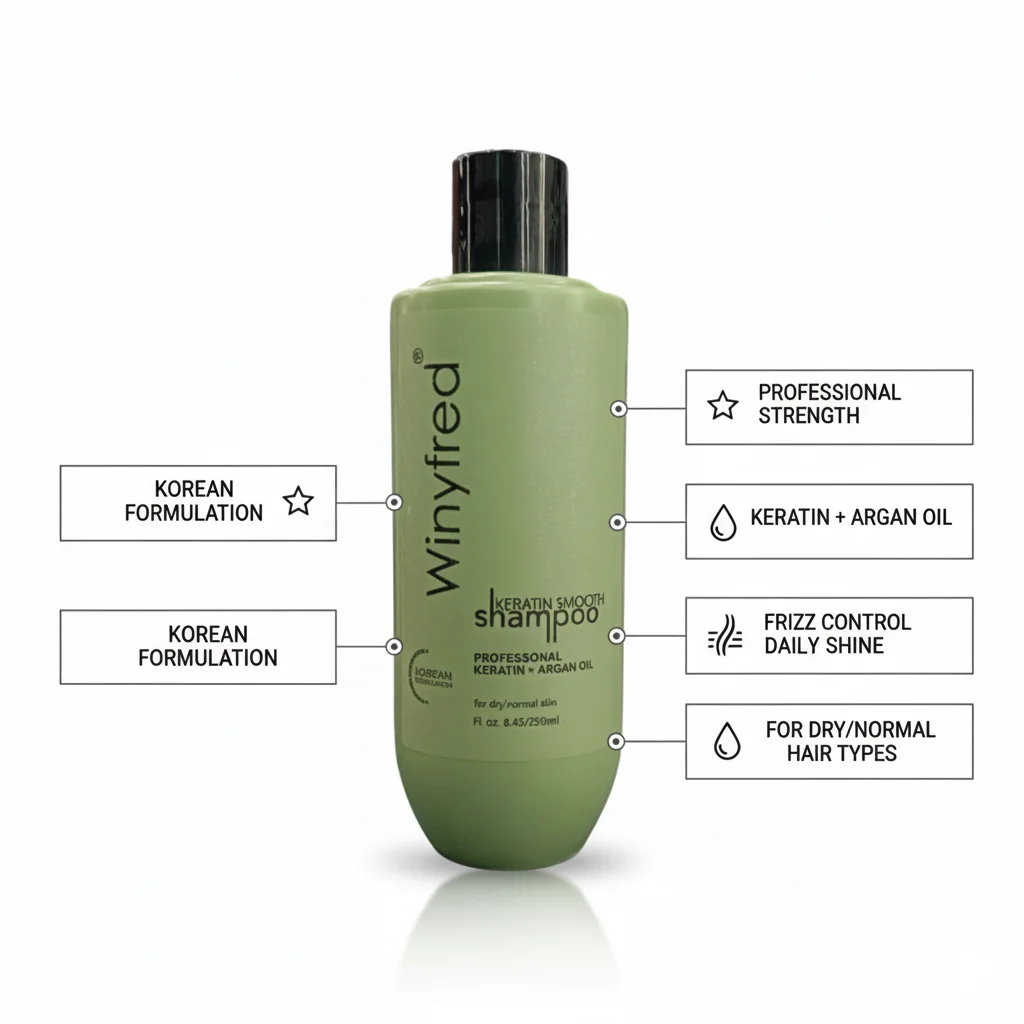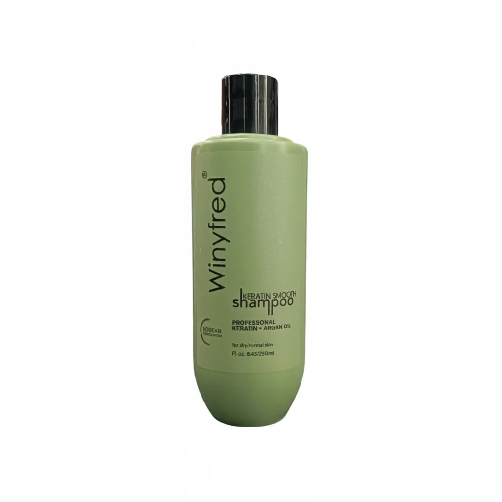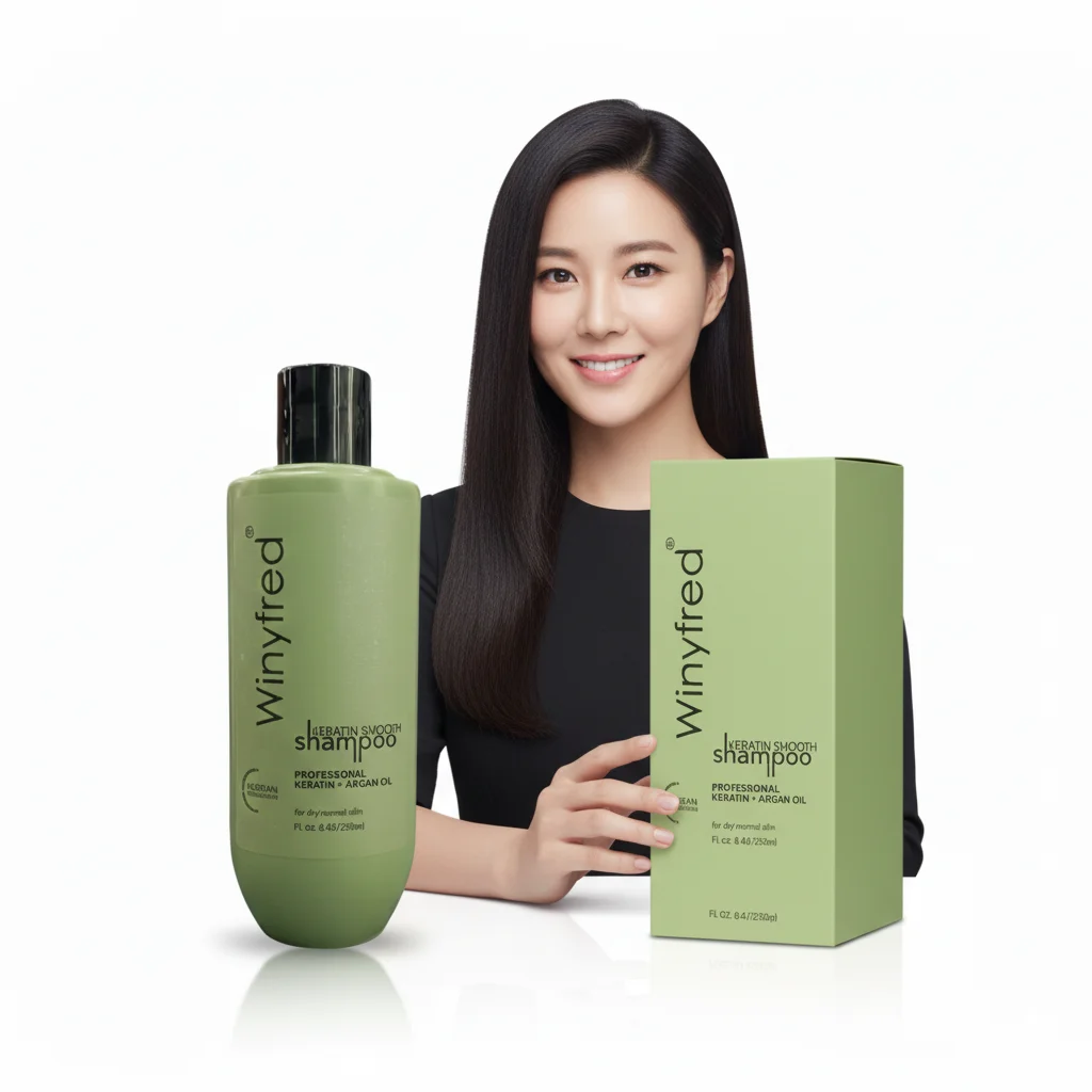 This image showcases a hair care product from the “Winyfred” brand, specifically their “Keratin Smooth Shampoo.” The product is presented with a sleek, olive-green bottle and its matching retail box. A smiling woman with long, smooth, dark hair is featured behind the product, visually reinforcing the desired outcome of using the shampoo. The packaging design is clean, with “Winyfred” prominently displayed vertically on the bottle. Key ingredients like “Professional Keratin + Argan Oil” are highlighted, along with a note that it’s “for dry normal oily” hair, indicating versatility. The volume is specified as “FL OZ 8.45 / 250ml.”