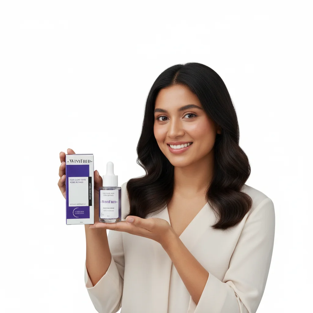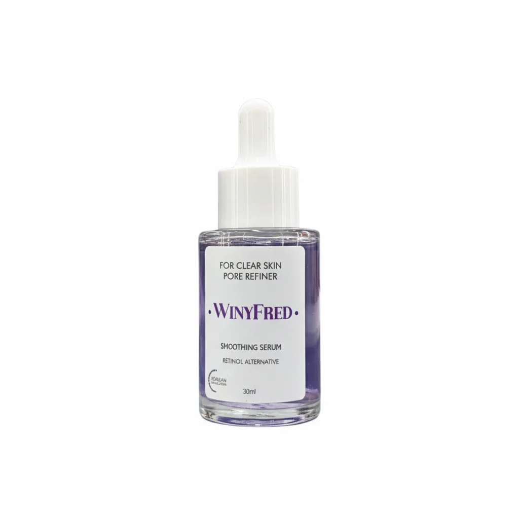 This image showcases a small, clear glass dropper bottle containing a light purple liquid, indicating a serum product from the “WINYFRED” brand. The label is white with prominent purple text for the brand name, aligning with the serum’s color. Key information on the label includes “FOR CLEAR SKIN PORE REFINER,” “SMOOTHING SERUM,” and “RETINOL ALTERNATIVE.” It also specifies a volume of “30ml.” The bottle has a white dropper top, characteristic of serums designed for precise application. The overall aesthetic is clean, modern, and suggests a focus on targeted skincare solutions.
