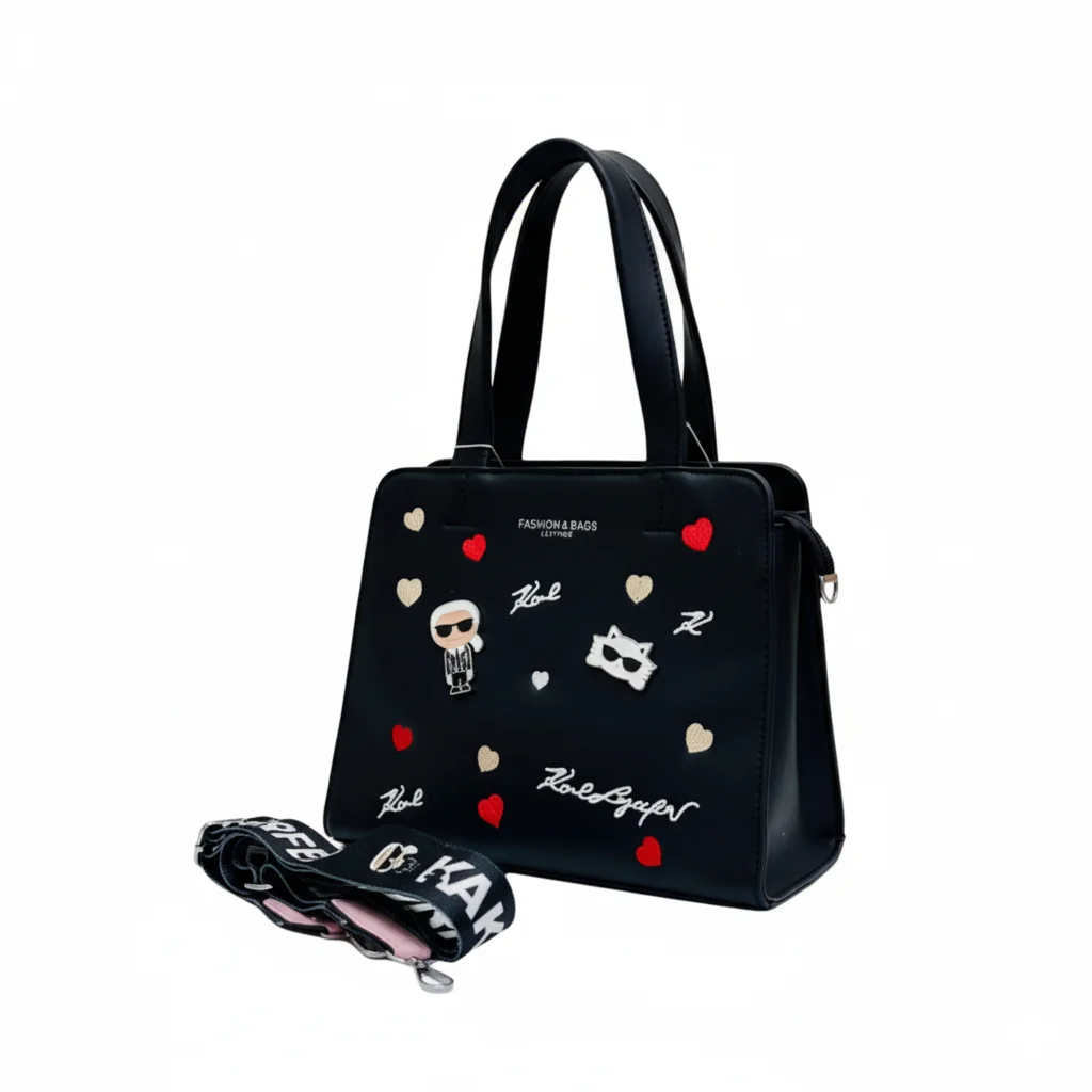 Add a touch of playful high-fashion flair to your daily ensemble with this structured black tote bag. Heavily influenced by pop-culture fashion trends, this bag features stylized character patches of the iconic “Karl” figure with sunglasses and his famous cat, Choupette. The design is further embellished with embroidered heart motifs in red and gold, as well as white script lettering.