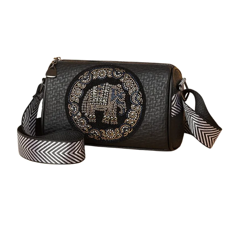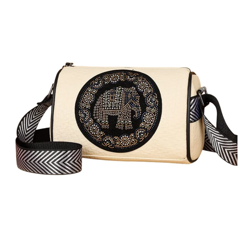 Women’s Cream Barrel Crossbody Bag with Rhinestone Elephant Motif – Trendy Cylindrical Shoulder Purse with Wide Chevron Pattern Strap