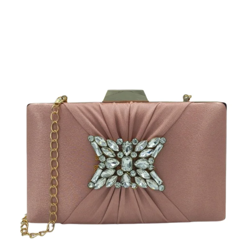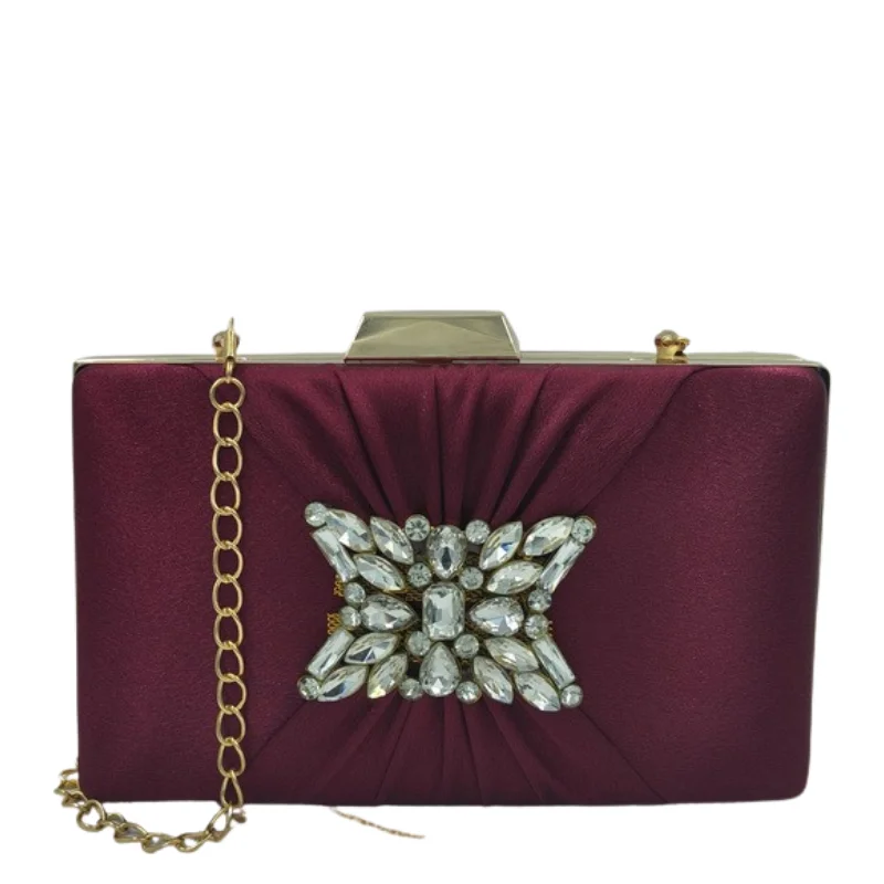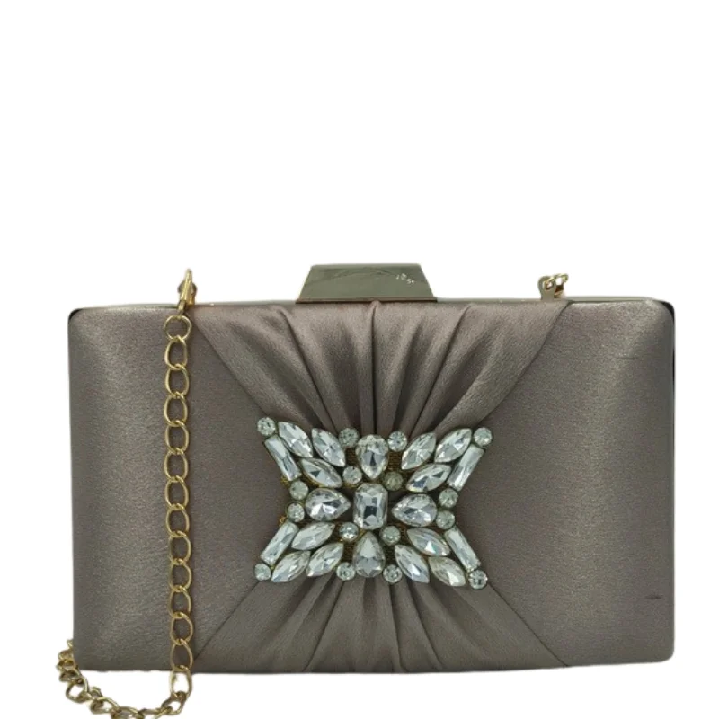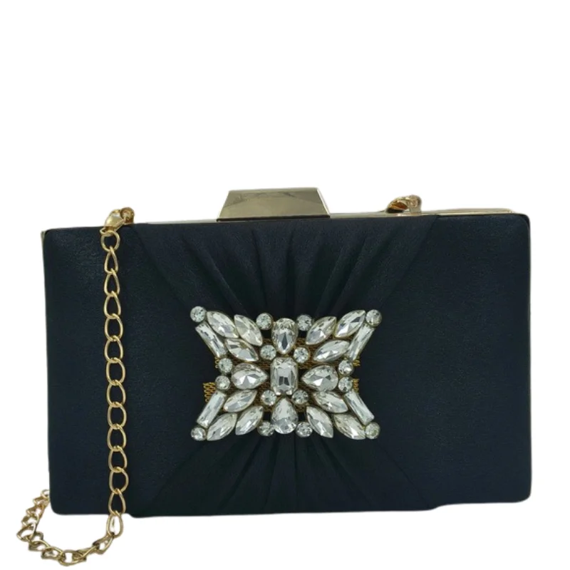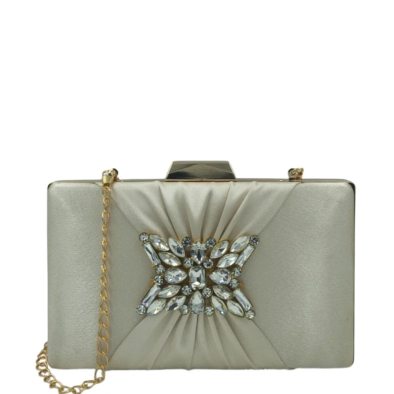 Women’s Elegant Pleated Satin Evening Clutch with Crystal Brooch & Detachable Gold Chain