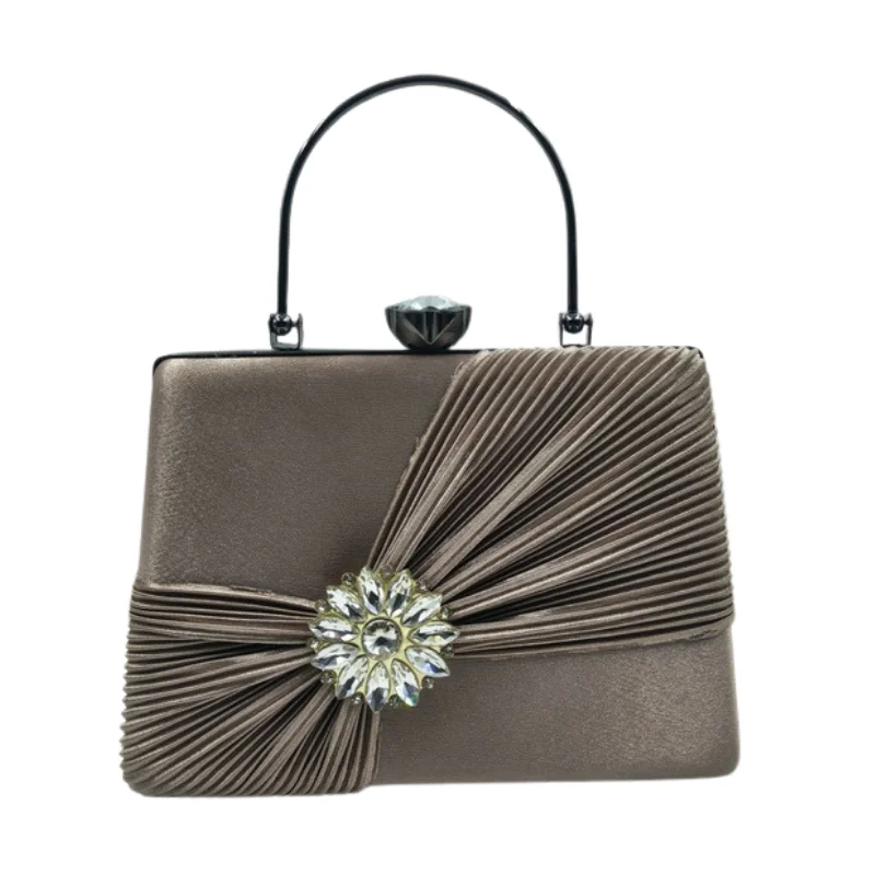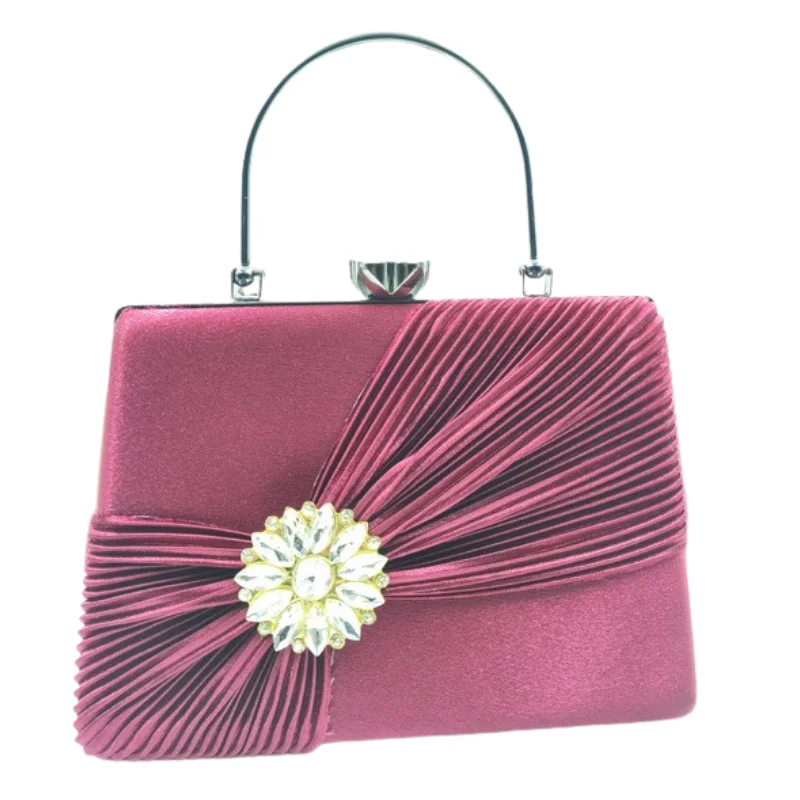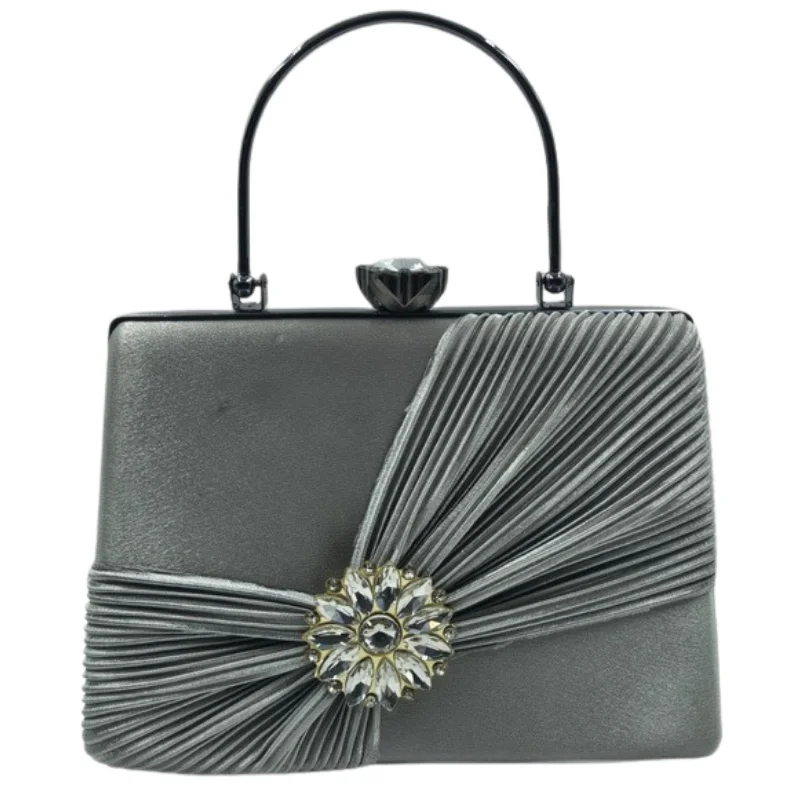 Women’s Elegant Satin Pleated Evening Clutch Bag with Crystal Flower Brooch & Structured Top Handle