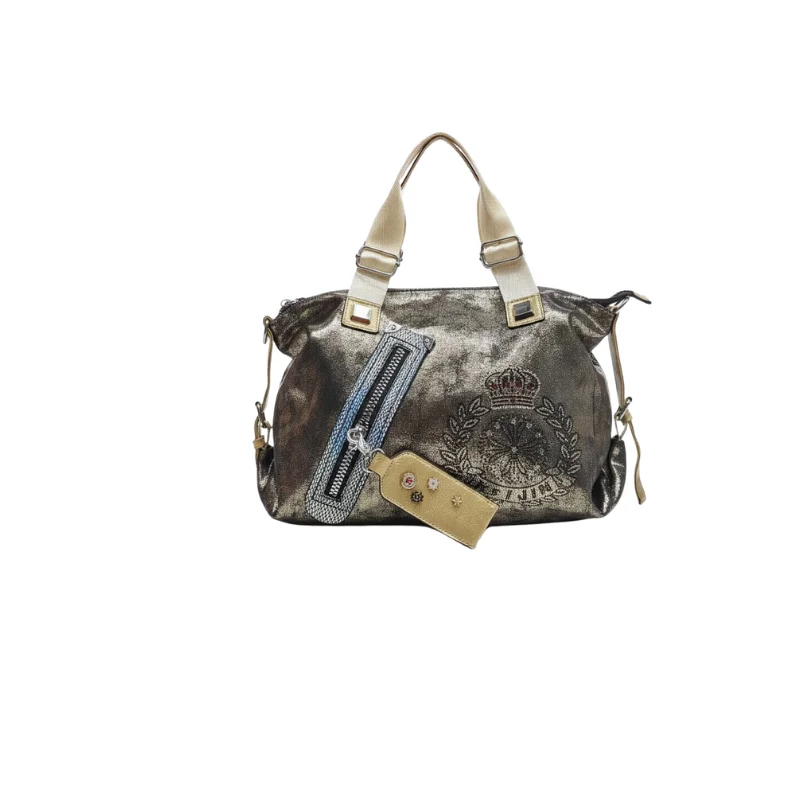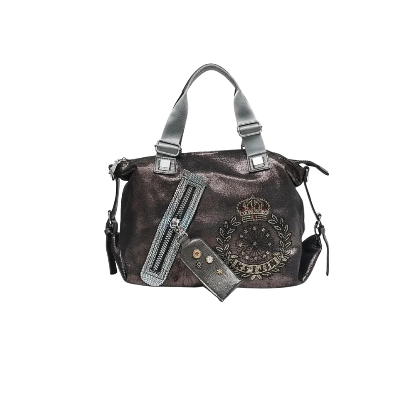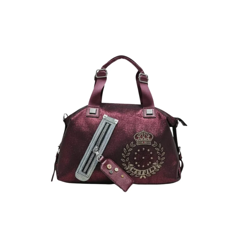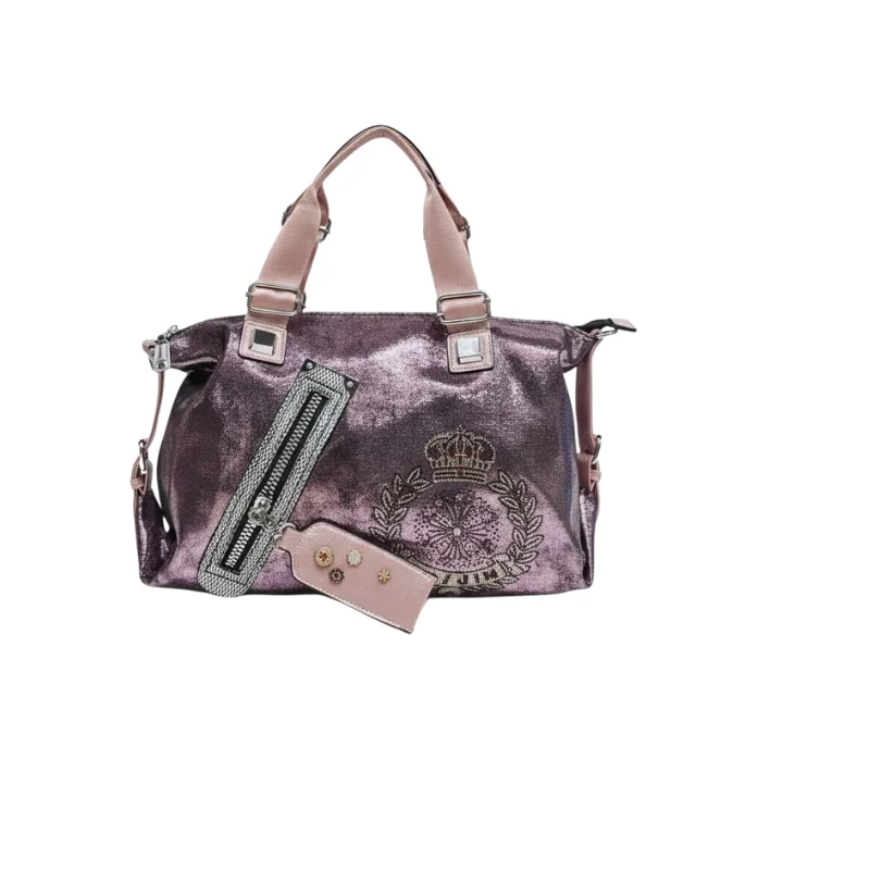 Women’s “Glam Rock” Leather Satchel – Rhinestone Crown Emblem & Decorative Diagonal Zipper Tote