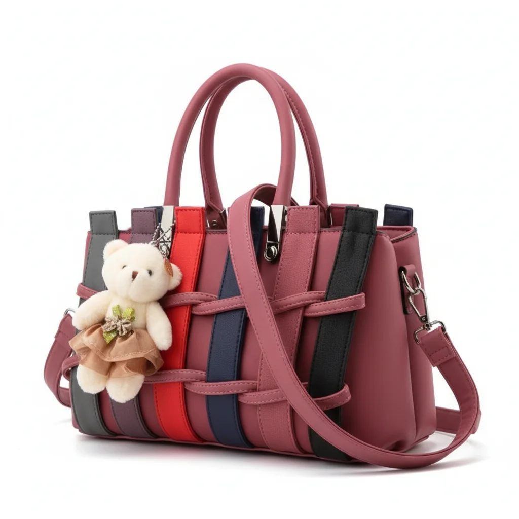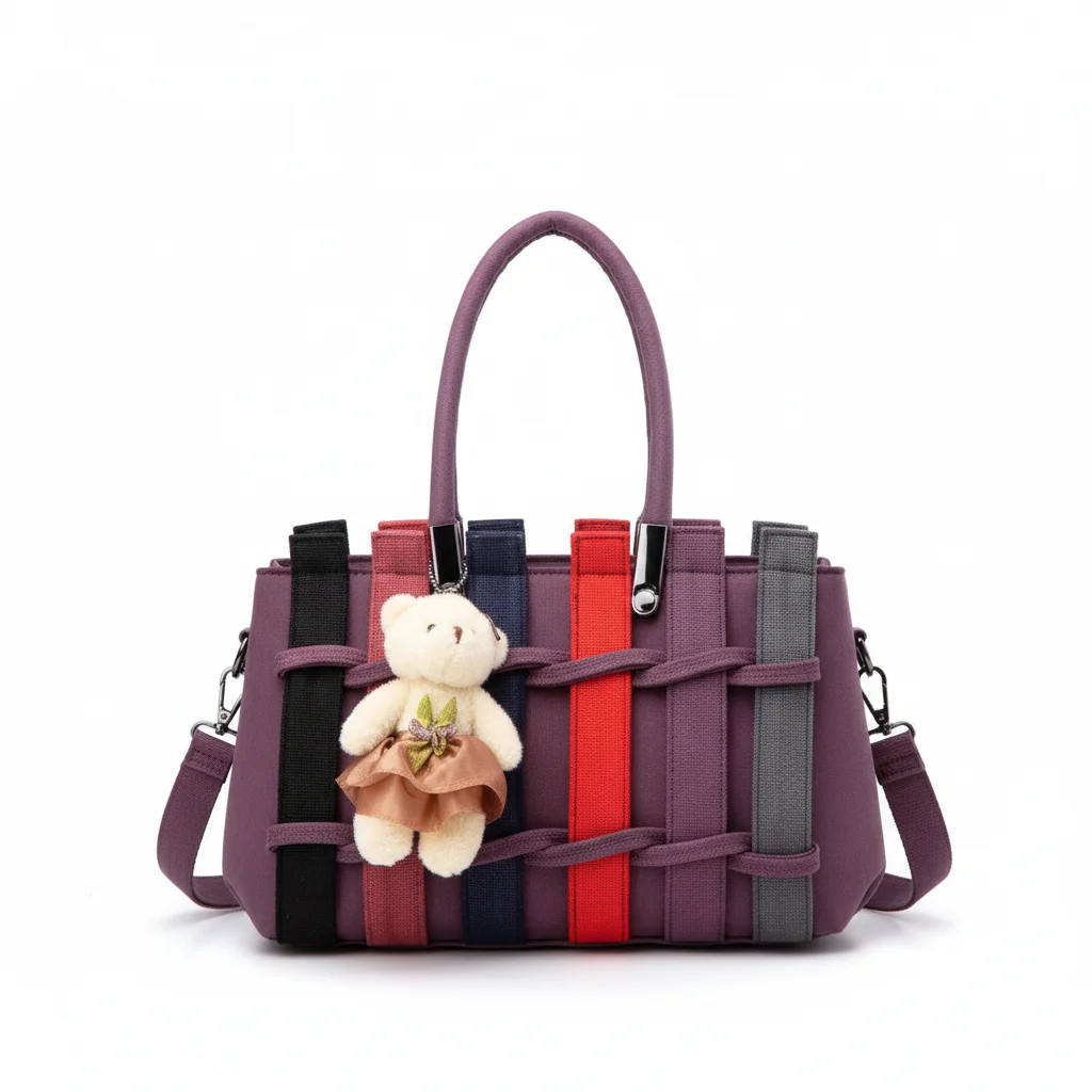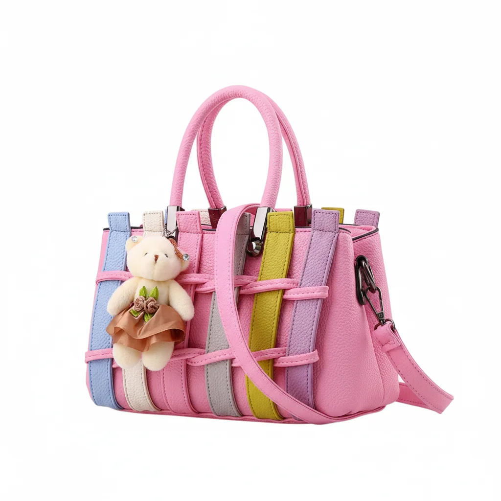 Women’s Multicolor Striped Handbag – Structured Woven-Style Tote with Adjustable Crossbody Strap & Plush Teddy Bear Charm
