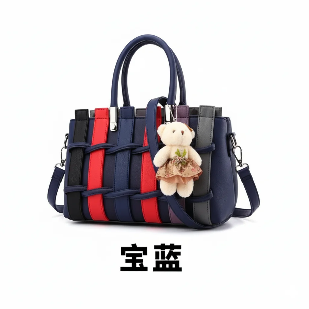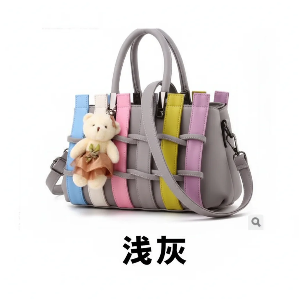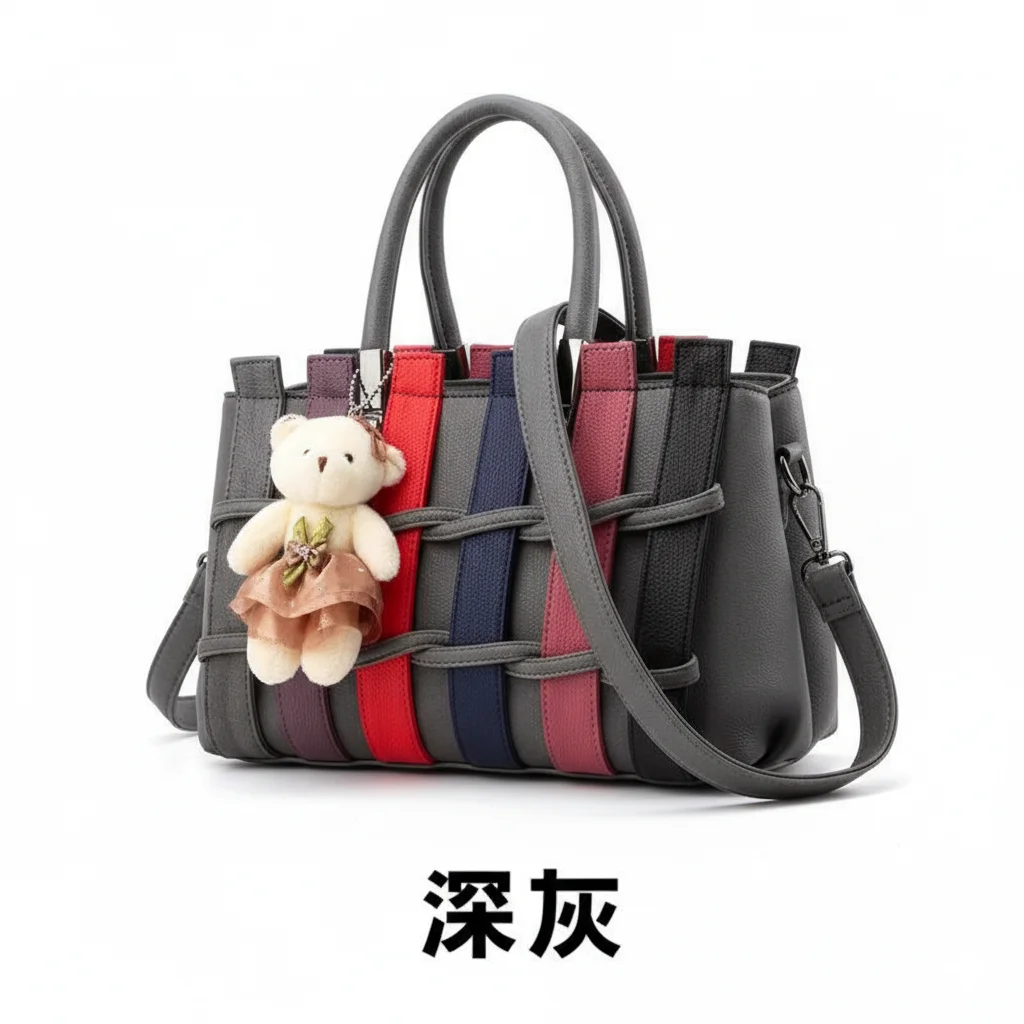 Women’s Multicolor Striped Handbag – Structured Woven-Style Tote with Adjustable Crossbody Strap & Plush Teddy Bear Charm