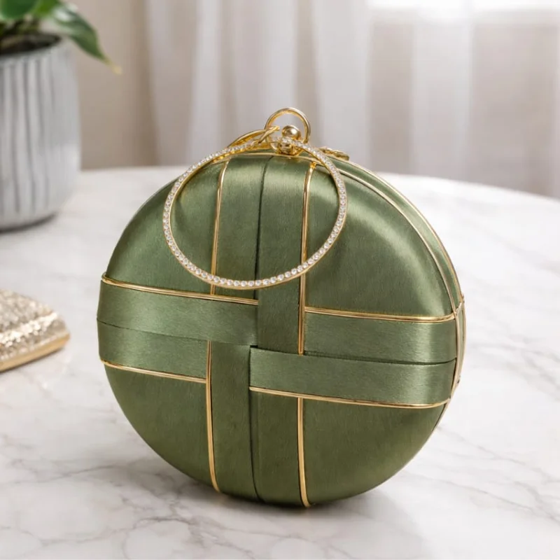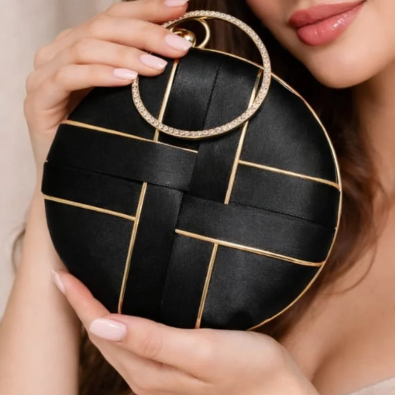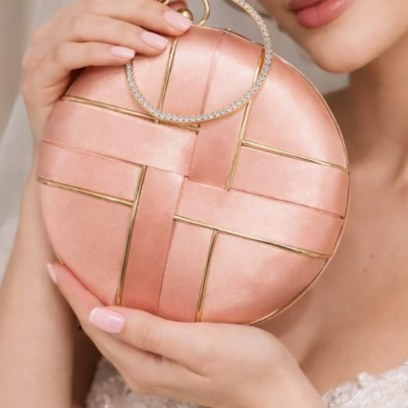Woven Satin Round Evening Clutch with Crystal Halo Ring Handle