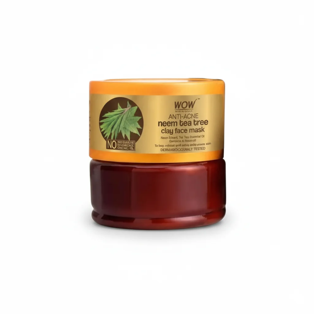 It is a clay face mask designed to combat acne. The key ingredients highlighted are Neem, Tea Tree, Camphor, and Fenugreek. It emphasizes being free from silicones, parabens, and mineral oil. The product is also dermatologically tested and is indicated to help purify pores, absorb excess oil, and potentially delay the appearance of acne.