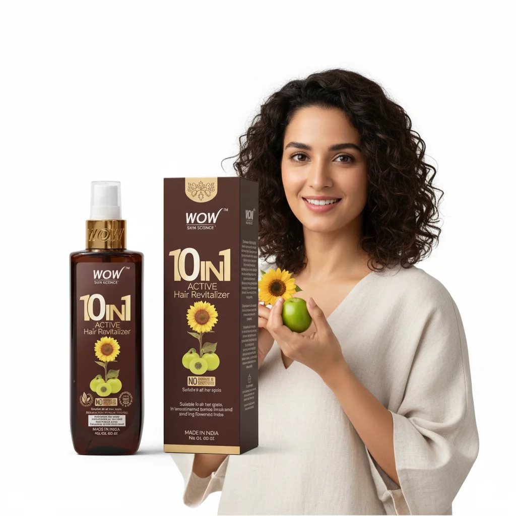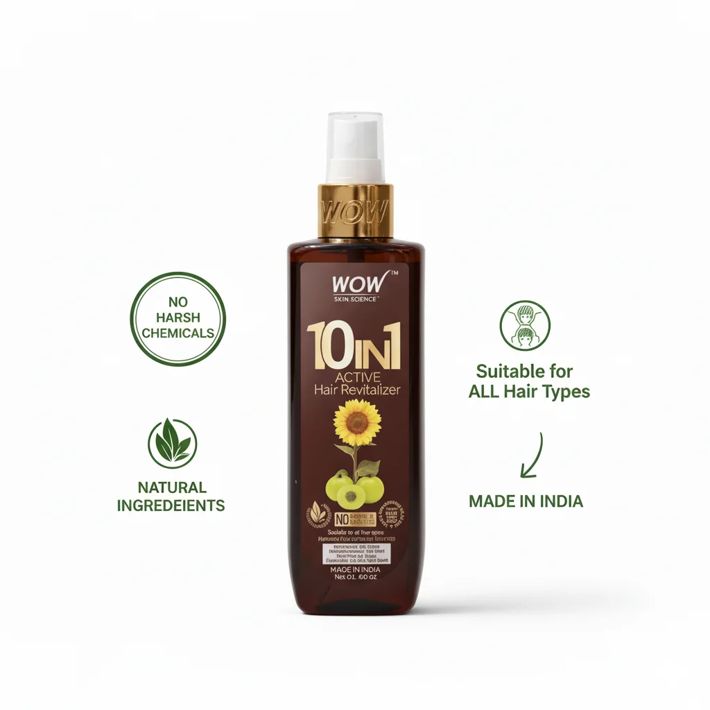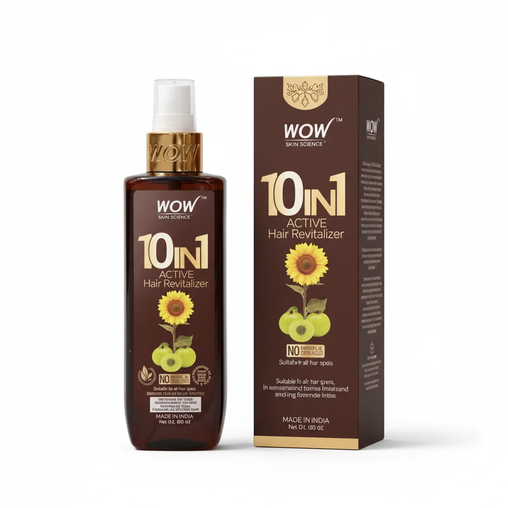 The WOW Skin Science 10 in 1 Active Hair Revitalizer is a hair care product designed to nourish and revitalize hair. It comes in a spray bottle with a brown, translucent liquid, suggesting a blend of natural ingredients. The packaging prominently features illustrations of sunflowers and Indian gooseberry (Amla), indicating these as key components. The product aims to provide multiple benefits for hair health, as implied by “10 in 1 Active Hair Revitalizer.” It is made in India and states “No Mineral Oil,” “No Silicones,” “No Parabens,” and “No Synthetic Color,” highlighting a commitment to a more natural formulation. It also mentions “Sulfate-free all hair types,” suggesting it’s suitable for a wide range of users and gentle on hair. The box reiterates some of these claims and includes additional text, likely detailing usage instructions and further benefits.
