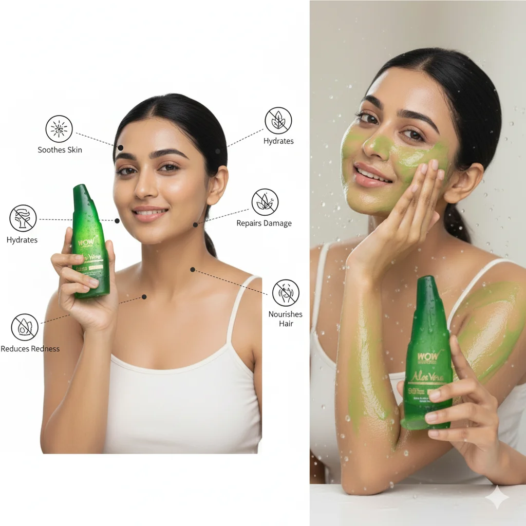 WOW Skin Science Aloe Vera Gel is a versatile beauty and wellness product, prominently featuring natural aloe vera. The packaging is a vibrant green, ergonomically shaped bottle, suggesting it’s easy to hold and dispense. The label clearly states “Aloe V 99%” and “WOW Skin Science,” indicating a high concentration of aloe vera and the brand identity. The product is designed for multiple applications, as shown by the two different scenarios in the image. One woman is depicted applying the green gel to her face and body, suggesting its use for skin hydration, soothing, and general skincare. Water droplets around her imply a refreshing and hydrating effect. The other woman is shown holding the product, highlighting its potential benefits for hair care as she gently touches her long, dark hair. The overall impression is one of natural purity, hydration, and comprehensive care for both skin and hair.