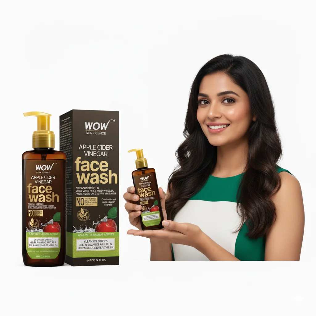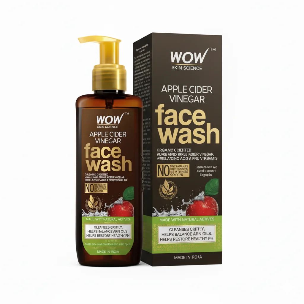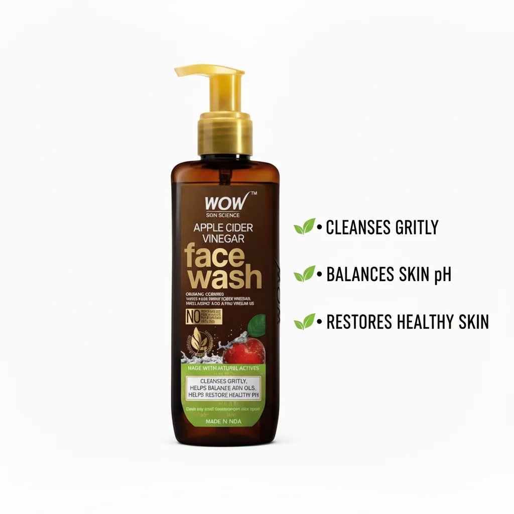 This face wash is designed to cleanse skin gently, help balance excess oil, and restore a healthy pH level. It is made with natural actives, prominently featuring organic certified Apple Cider Vinegar. The packaging highlights that it is free from parabens, sulfates, and silicones. The bottle has a pump dispenser for easy use.