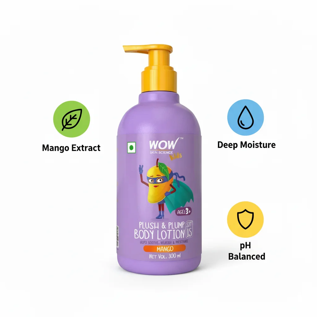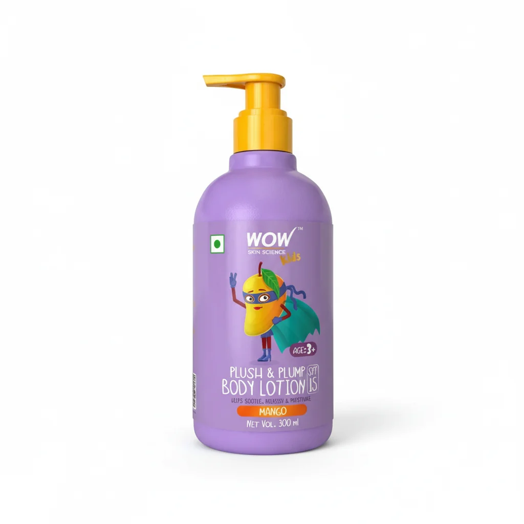 The WOW Skin Science Kids Plush & Plump SPF 15 Body Lotion in Mango is specially formulated for children aged 3 and above. This gentle body lotion is designed to provide triple benefits: it helps to soothe, nourish, and moisturize delicate young skin. With added SPF 15, it also offers a layer of protection against the sun’s harmful UV rays, making it ideal for daily use. Infused with a delightful mango fragrance and featuring a fun superhero mango character on the bottle, it encourages kids to enjoy their skincare routine. The lotion comes in a convenient pump bottle for easy application.