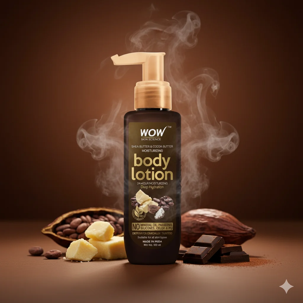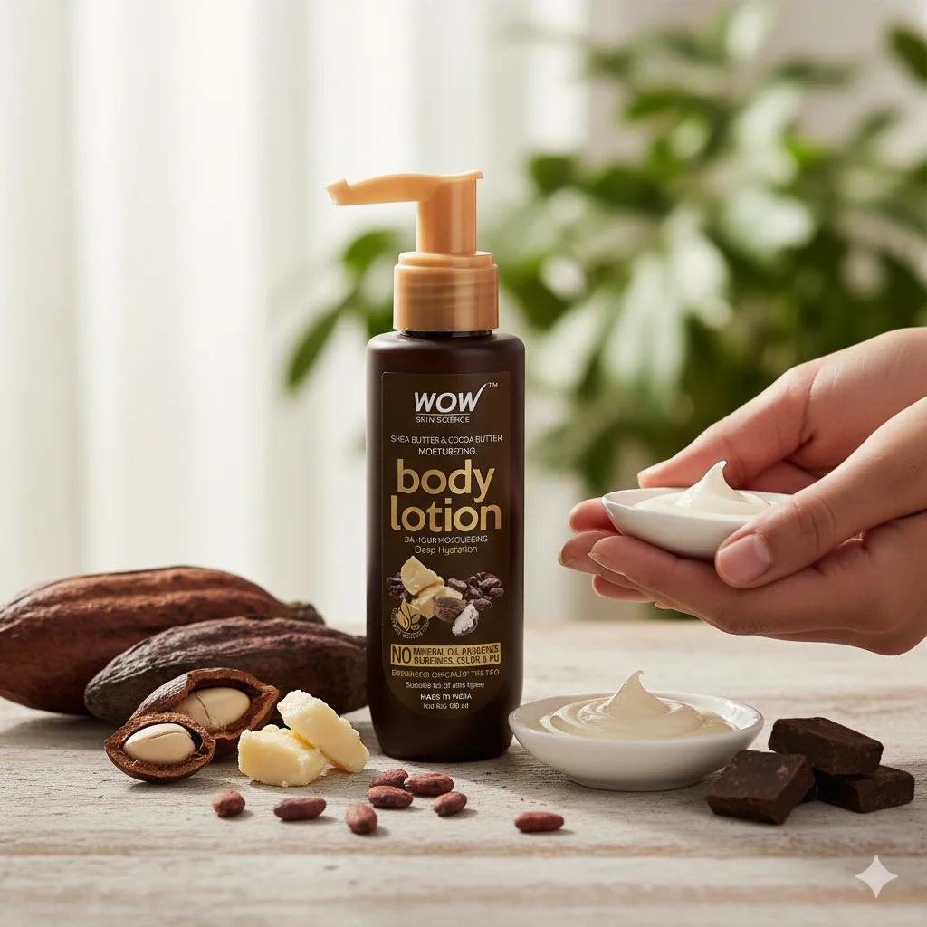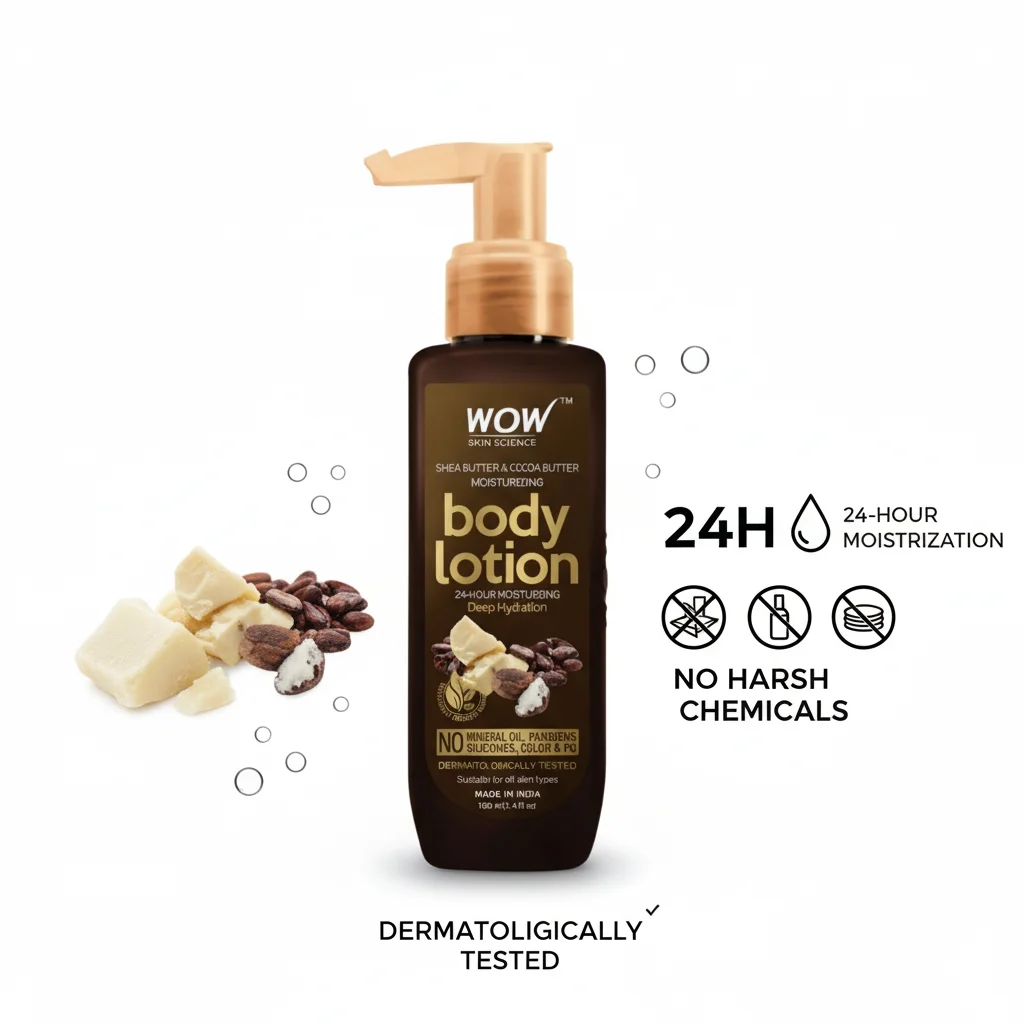 WOW Skin Science Shea Butter & Cocoa Butter Moisturizing Body Lotion is a rich, creamy formulation designed to deliver intense hydration and nourishment to your skin for up to 24 hours. Infused with the goodness of natural Shea Butter and Cocoa Butter, this body lotion works to replenish lost moisture, soothe dryness, and leave your skin feeling soft, smooth, and supple.