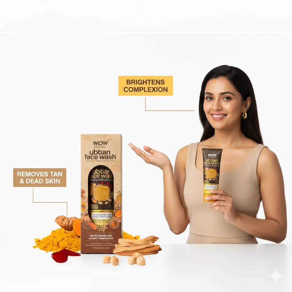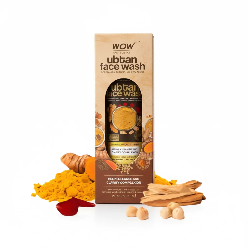 The WOW Skin Science Ubtan Face Wash is a facial cleanser inspired by traditional Ubtan recipes. It is enriched with natural ingredients like Chickpea Flour (Besan), Turmeric, Saffron, and Sandalwood, all of which are visible as raw ingredients around the product. The product is designed to “HELP CLEANSES AND CLARIFY COMPLEXION,” suggesting benefits for brightening and purifying the skin. The packaging, a tube, is housed within a carton box that showcases images of the key ingredients and highlights the Ubtan tradition. It is explicitly stated as being “DERMATOLOGICALLY TESTED.” The product comes in a 100 ml / 3.38 fl. oz. size. The overall aesthetic of the packaging and surrounding ingredients emphasizes its natural and traditional formulation.