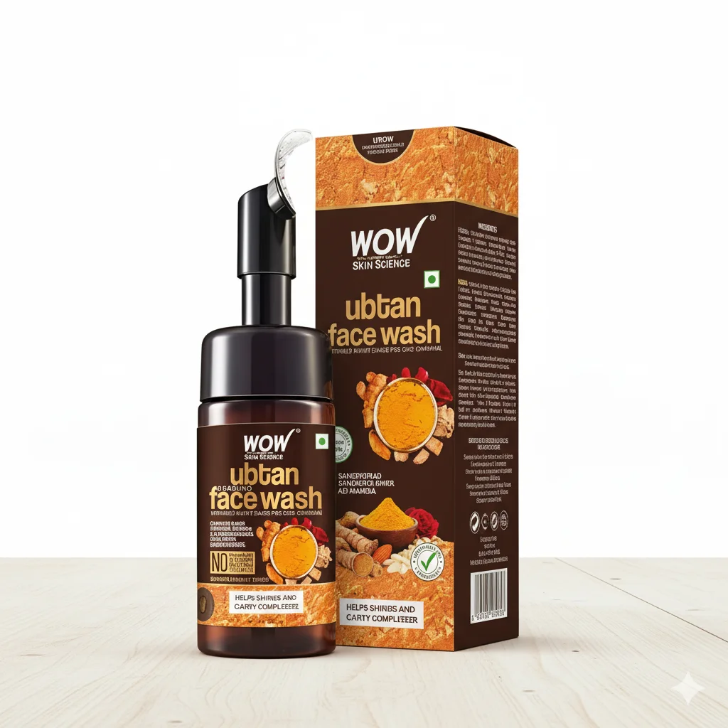 The WOW Skin Science Ubtan Face Wash is a foaming facial cleanser designed to help improve skin radiance and complexion. The product comes in a dark brown bottle with a pump dispenser and a built-in brush applicator, suggesting a convenient and effective way to cleanse the face. The packaging highlights “Ubtan,” a traditional Indian beauty paste made from natural ingredients, indicating that this face wash incorporates similar components. The box and bottle prominently feature images of turmeric (haldi), saffron (kesar), and possibly other natural ingredients like almond and chickpea flour, which are common in ubtan formulations. The design emphasizes a natural and skin-benefiting approach to skincare.