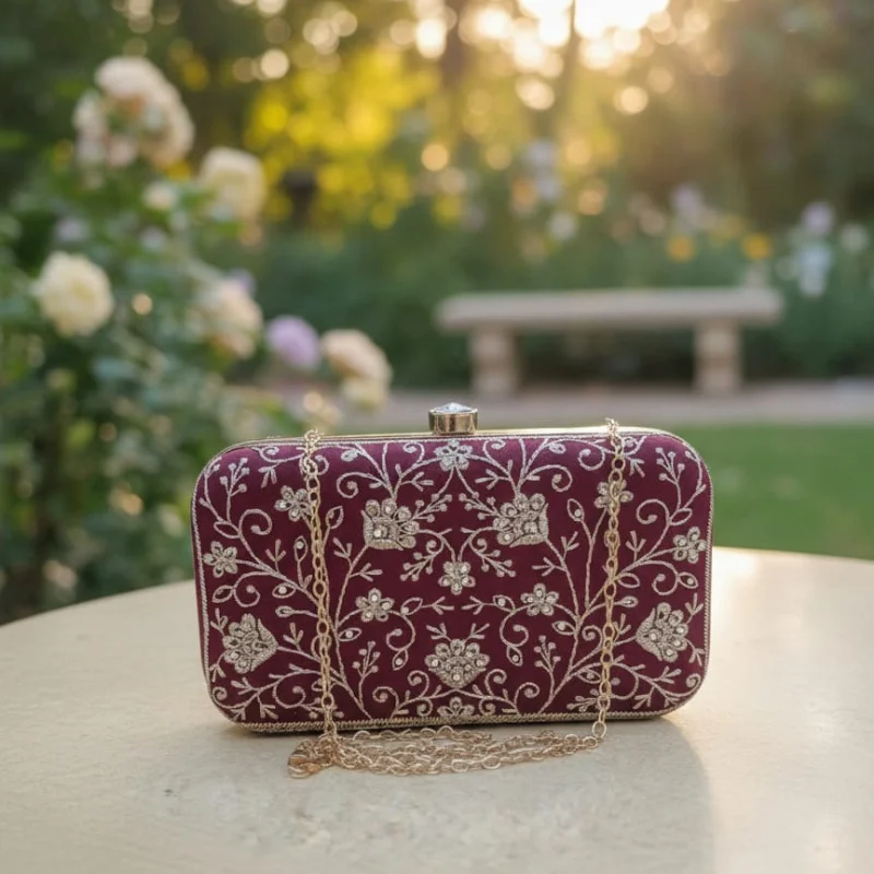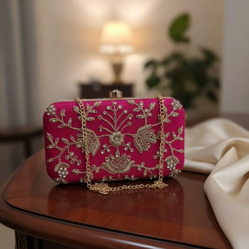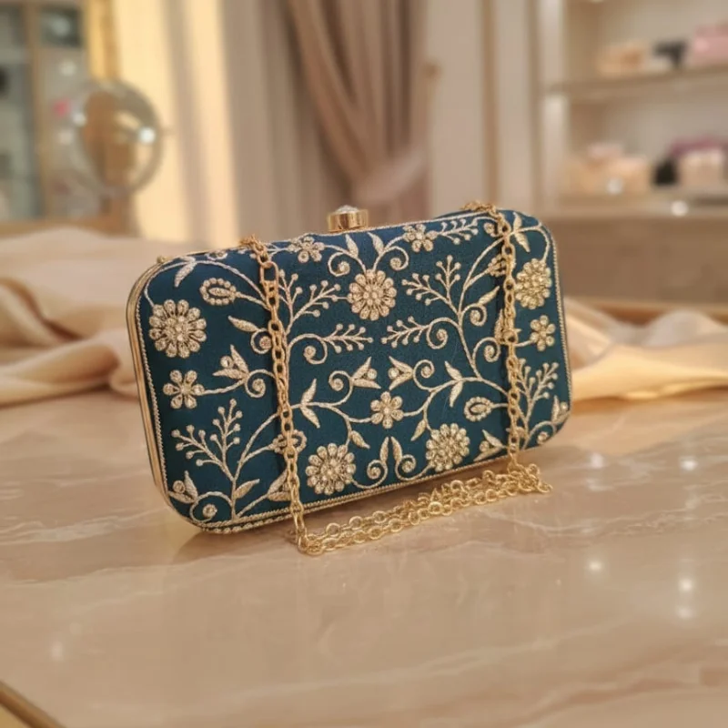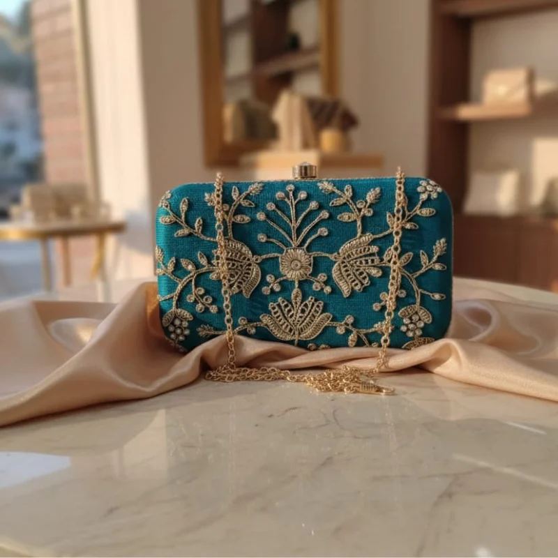 Zari Embroidered & Crystal Embellished Ethnic Box Clutch with Gold Chain